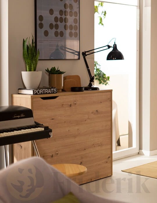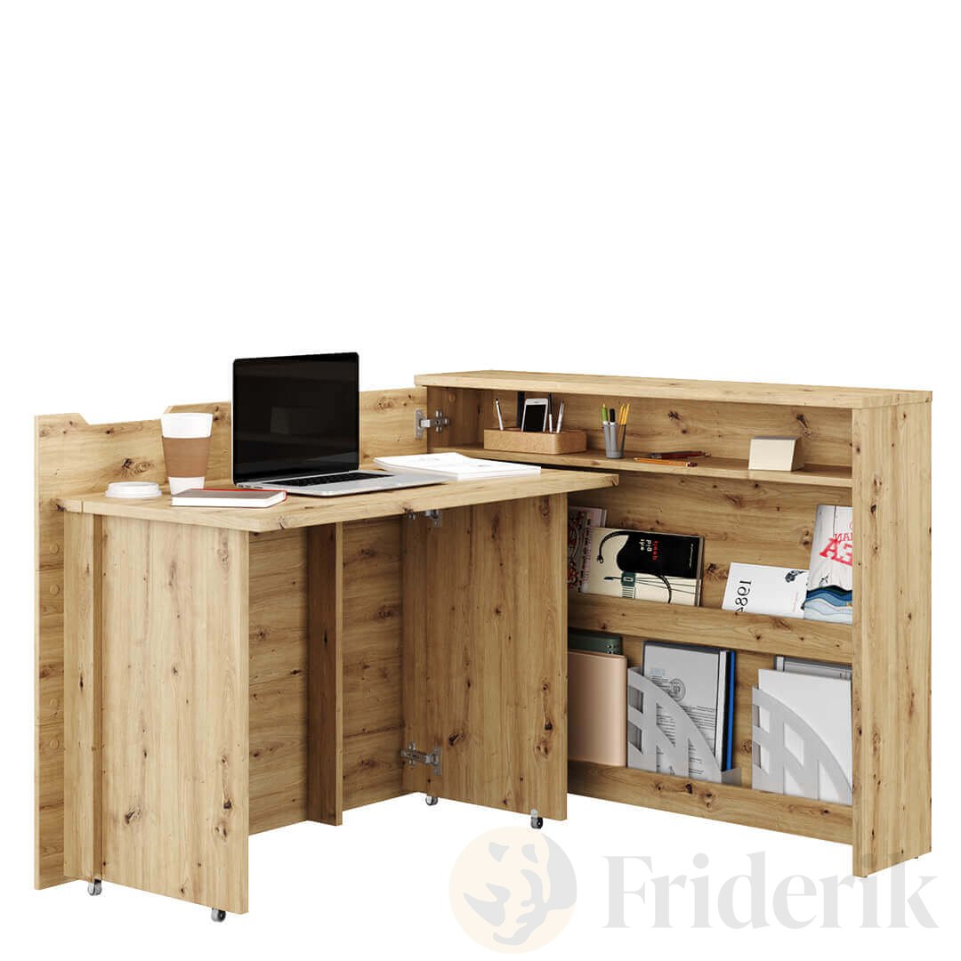 Stellen Sie sich ein Zuhause vor, in dem jedes Möbelstück sowohl praktisch als auch stilvoll ist. Der ausziehbare Schreibtisch Eiche Artisan verwandelt sich im Handumdrehen von einer kompakten Kommode in einen vollwertigen Arbeitsplatz. Ideal für Kinder- oder Jugendzimmer, das Büro, kleine Einzimmerwohnungen oder Wohnungen von Singles und Senioren.