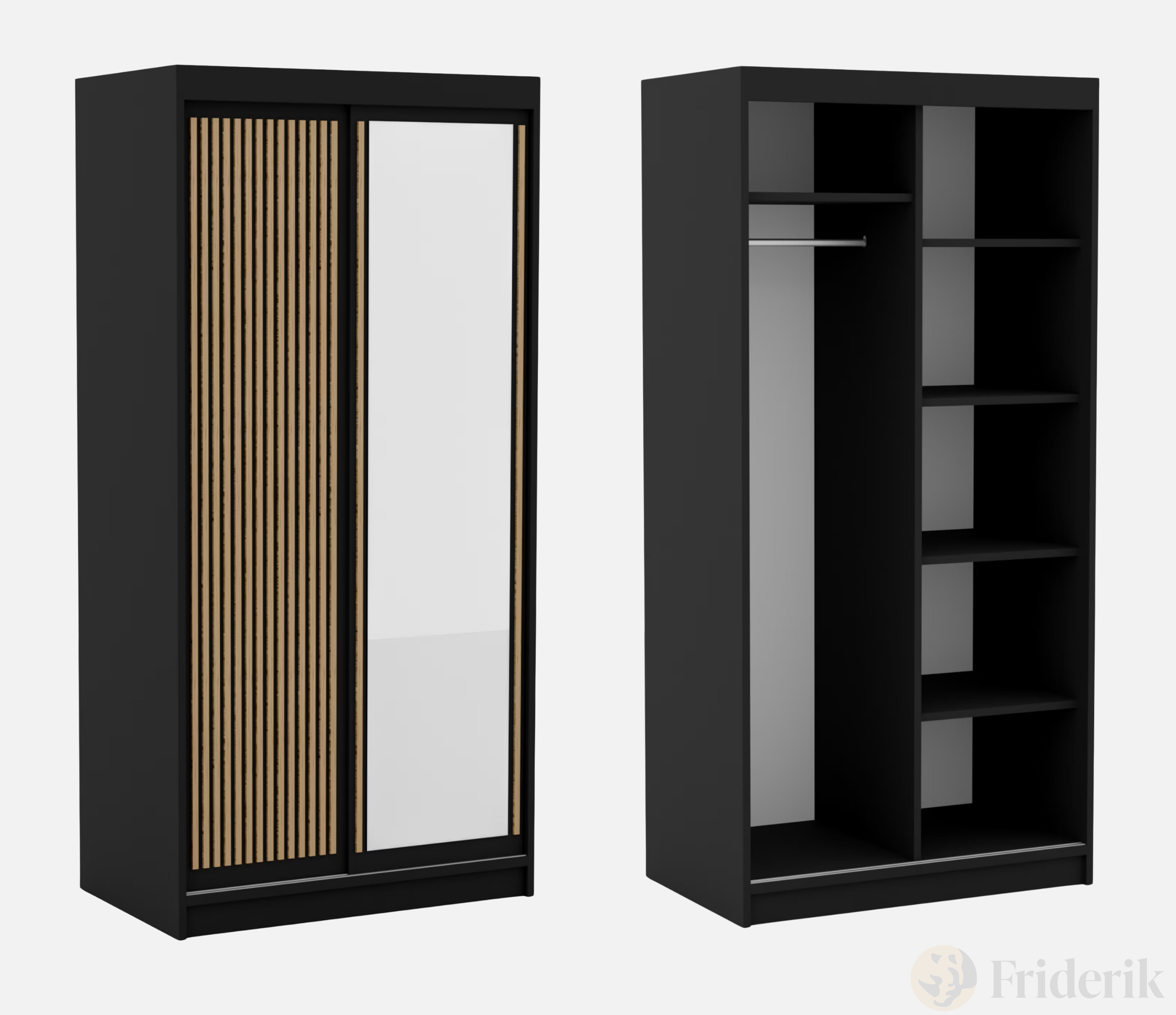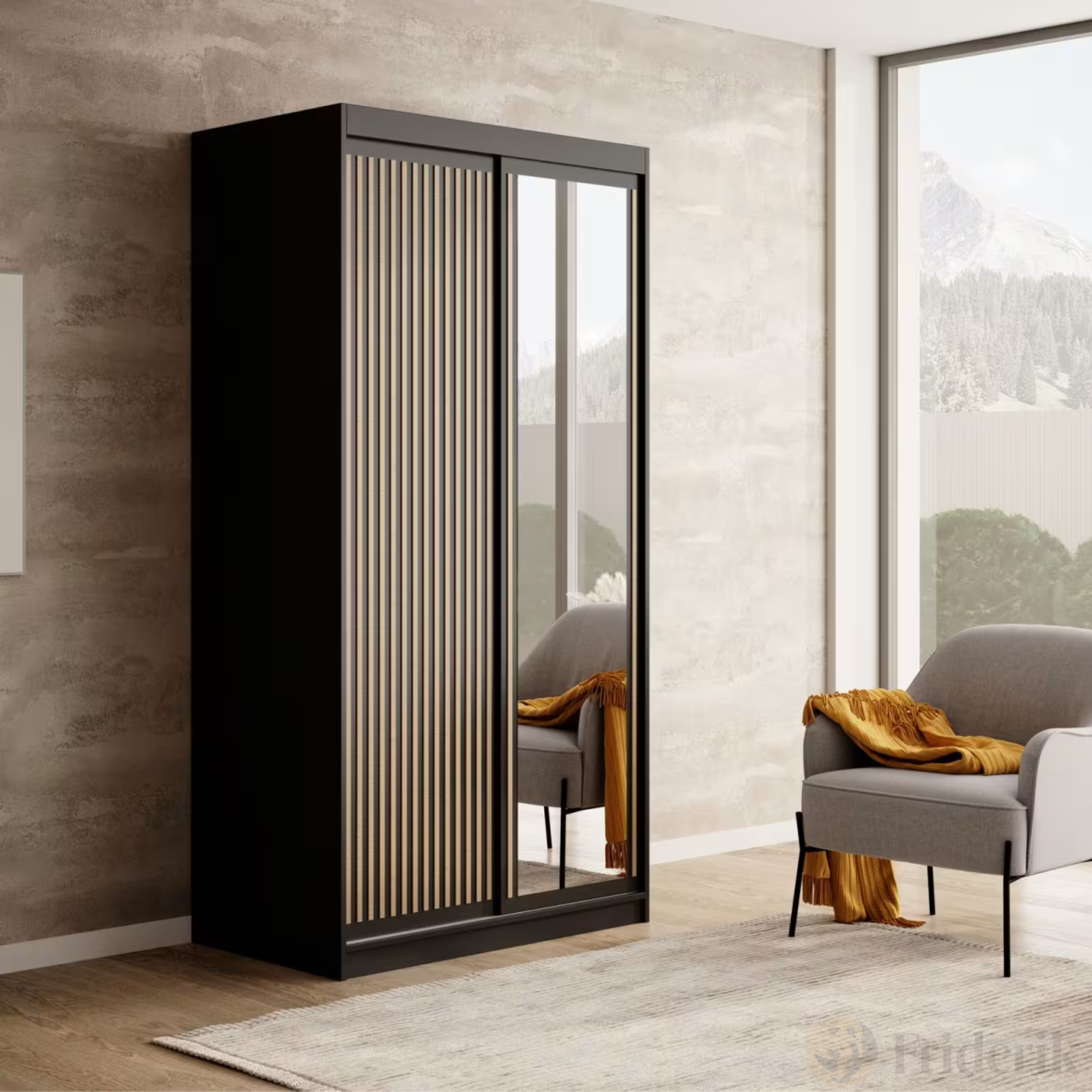 DELIA Kleiderschrank – Moderner Lamellen-Schrank, Schiebetürenschrank mit Spiegel & Stauraum | 100 cm - Schwarz / Holz