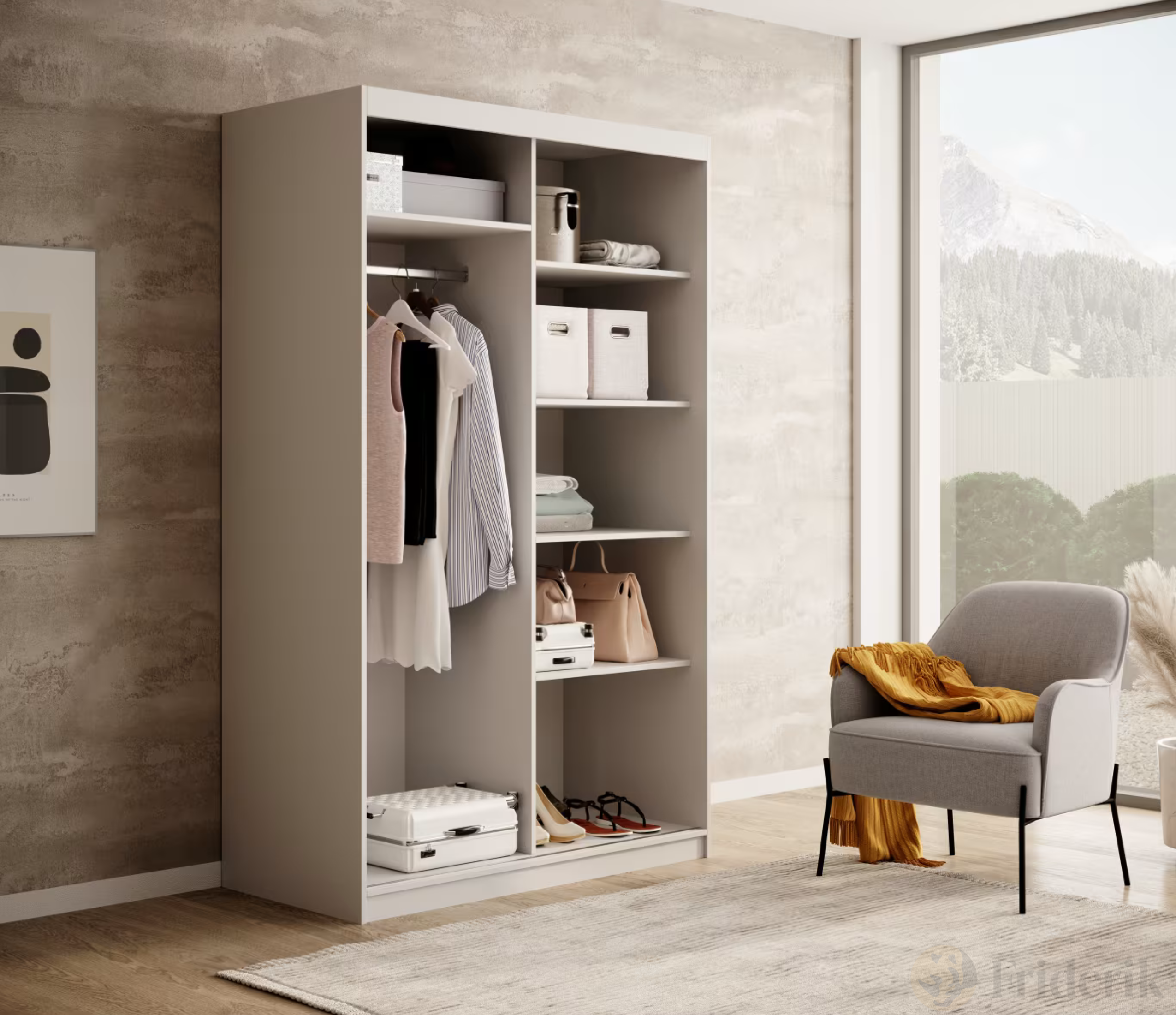 Der Schiebetürenschrank DELIA vereint modernes Design, Funktionalität und praktischen Stauraum. Die Lamellentüren verleihen dem Schrank Leichtigkeit und Eleganz und passen sich problemlos an unterschiedliche Einrichtungsstile an. Dank der Schiebetüren benötigen Sie keinen zusätzlichen Platz zum Öffnen, und der integrierte Spiegel vergrößert optisch den Raum und ist praktisch für die tägliche Outfit-Kontrolle.