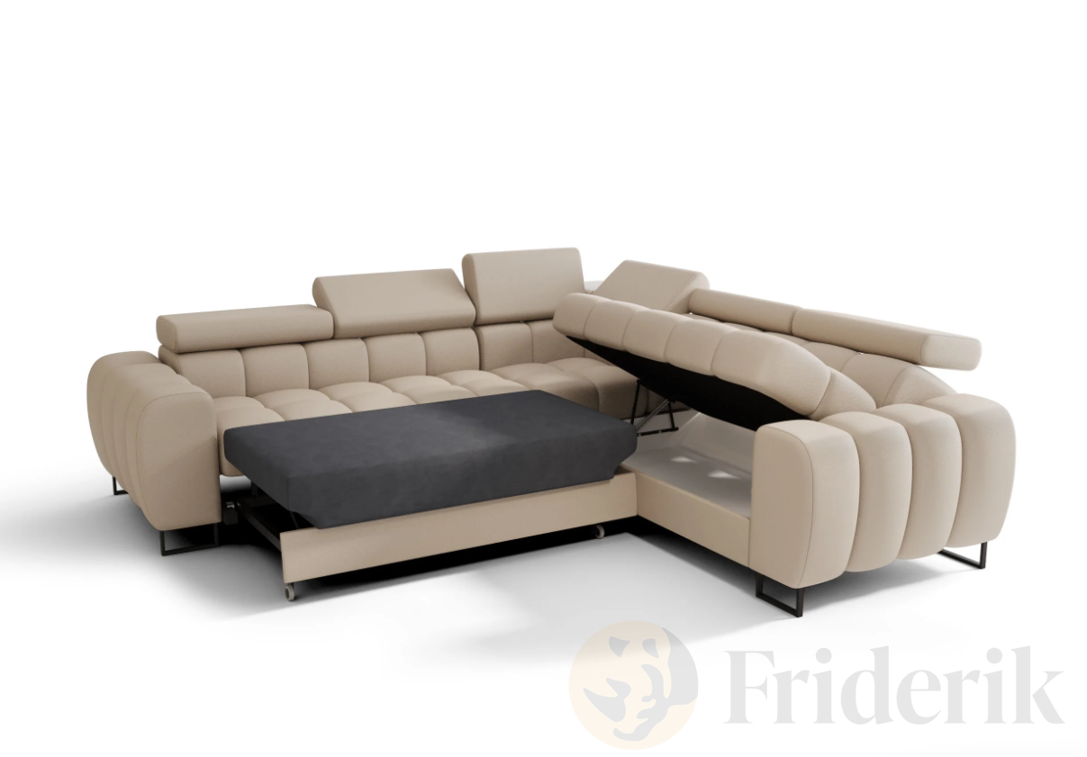Stell dir einen entspannten Nachmittag vor: Eine Tasse Kaffee in der Hand, deine Lieblingsserie läuft leise im Hintergrund, und du lehnst dich gemütlich zurück. Genau für solche Momente wurde das Ecksofa ASPEN MAX Olivgrün entworfen. Dieses symmetrisch gestaltete Sofa verbindet modernes Design mit praktischer Funktionalität und wird so zu deinem neuen Lieblingsplatz – egal ob für gesellige Runden mit Familie und Freunden oder als Ort zum Ausruhen und Entspannen. Dank der verstellbaren Kopfstützen findest du immer die bequemste Position, während der großzügige Bettkasten ausreichend Stauraum für deine Decken und Kissen bietet.
