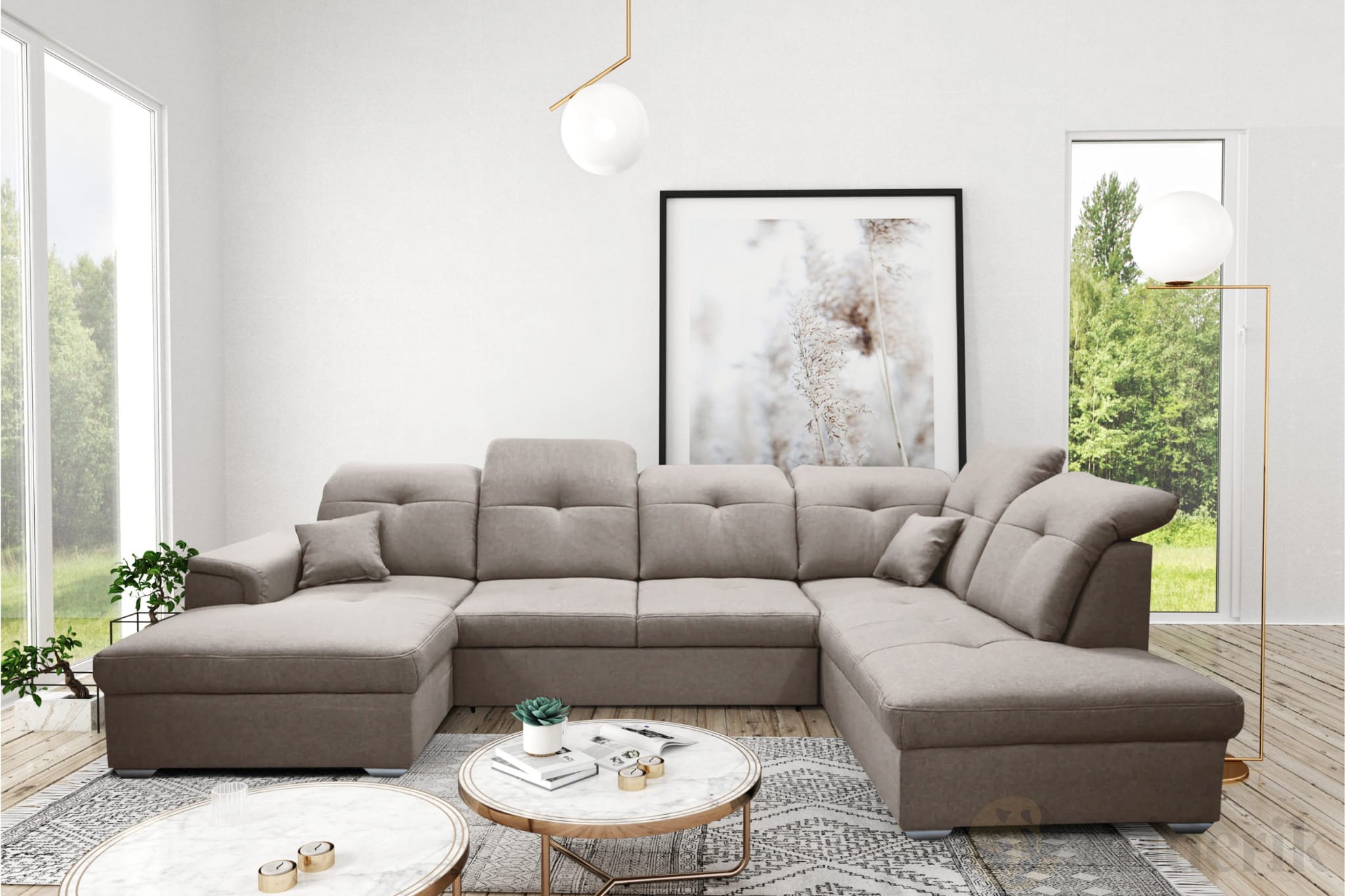 Ecksofa DAVIO U mit Schlaffunktion und Bettkasten und verstellbare Kopfstützen, Beige