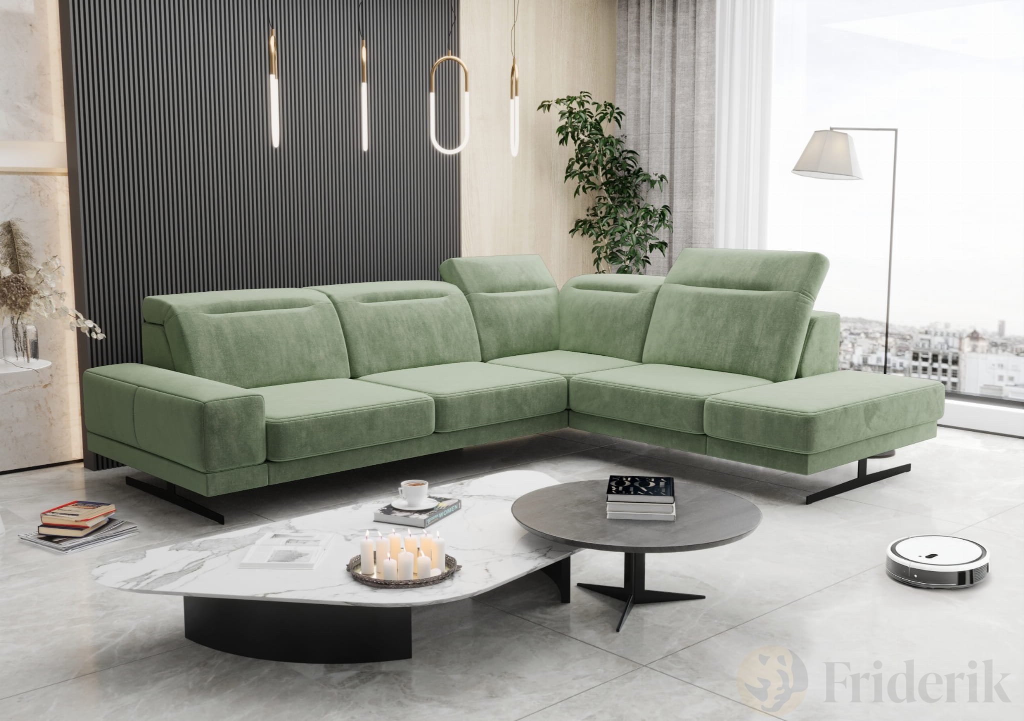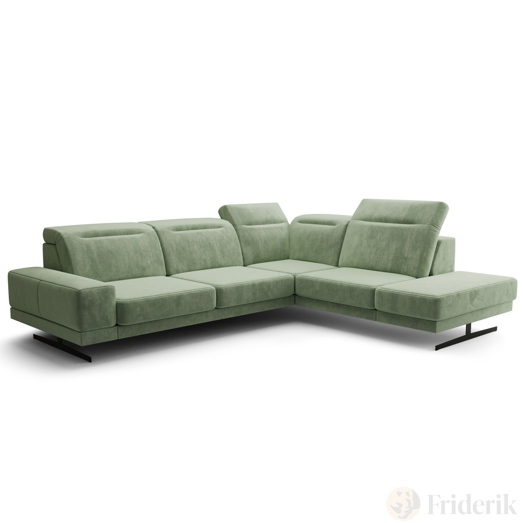 Ecksofa Fiore 265 × 220 cm mit verstellbaren Kopfstützen und T35-Schaum – Stoff Terra 33, Grün