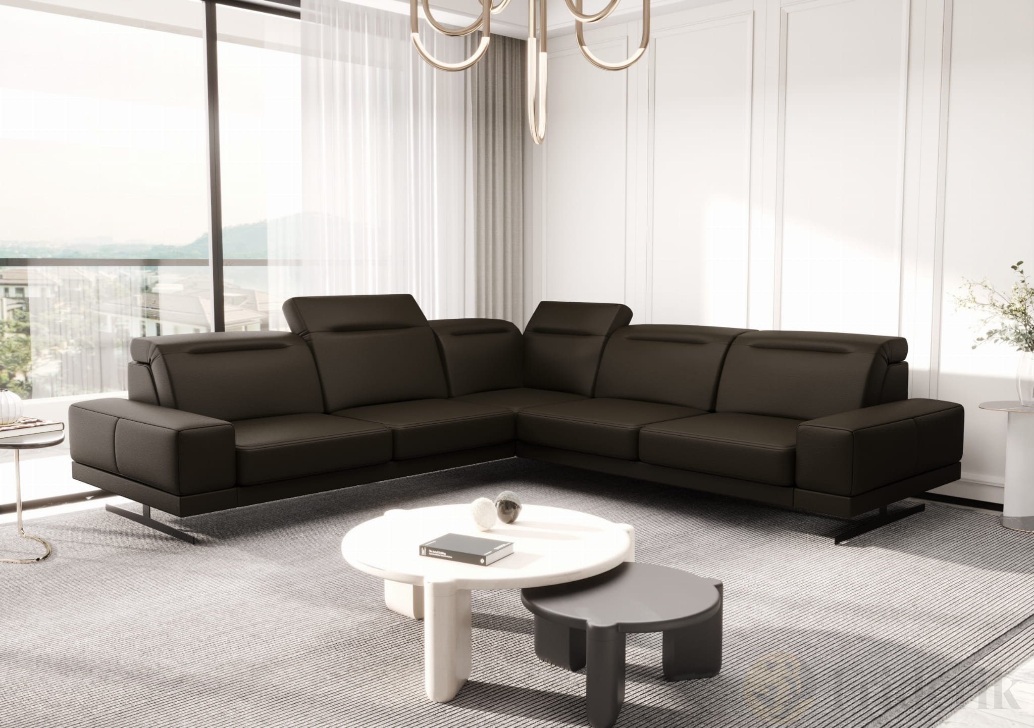 Ecksofa Fiore Max 265x265 cm mit T35 Schaum & Wellenfederung – modernes Ecksofa mit verstellbaren Kopfstützen, Echtleder L-10 - Olivbraun, Khaki