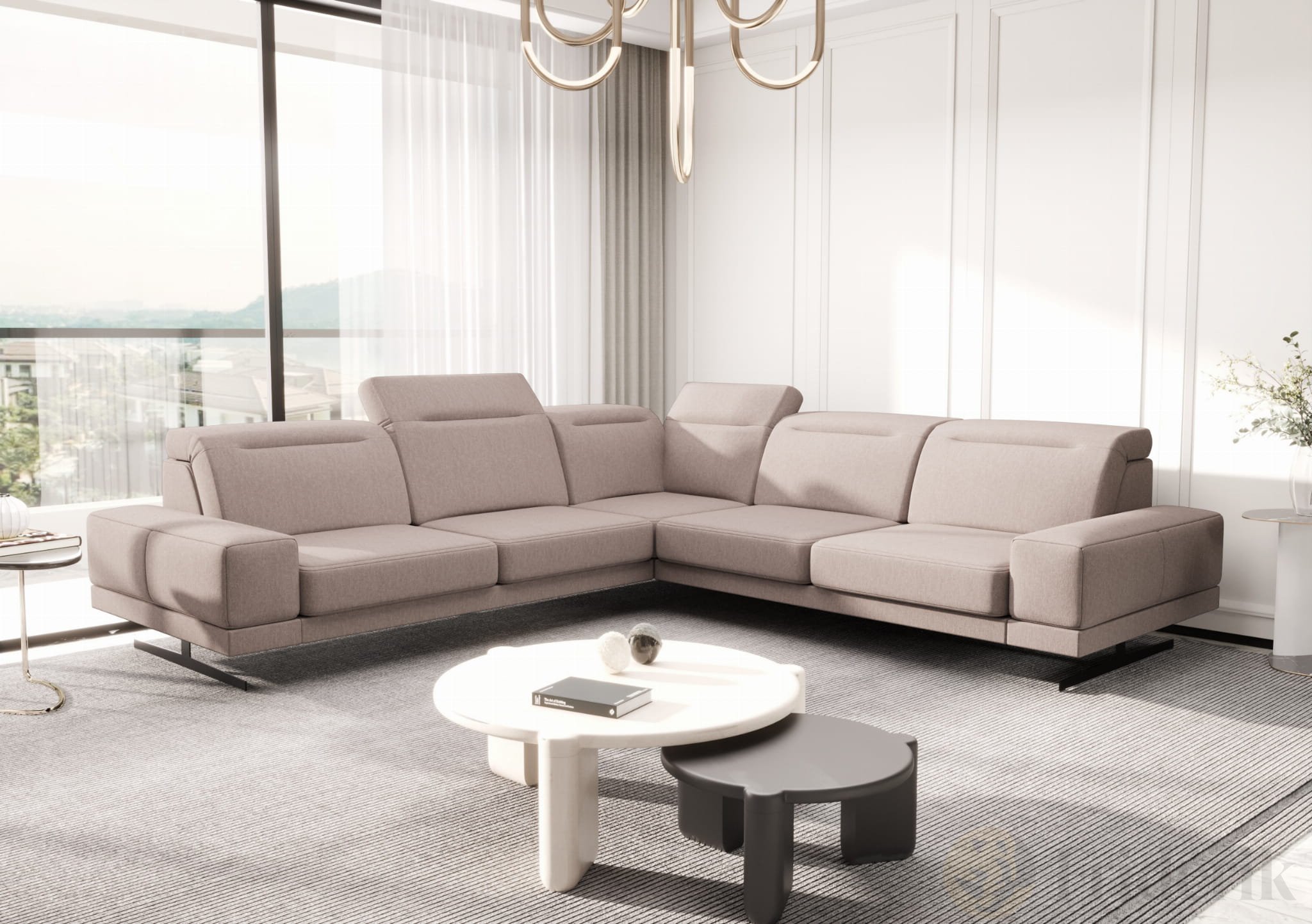 Ecksofa Fiore Max 265x265 cm mit T35 Schaum & Wellenfederung – modernes Ecksofa mit verstellbaren Kopfstützen, Gemma 04 - Beige