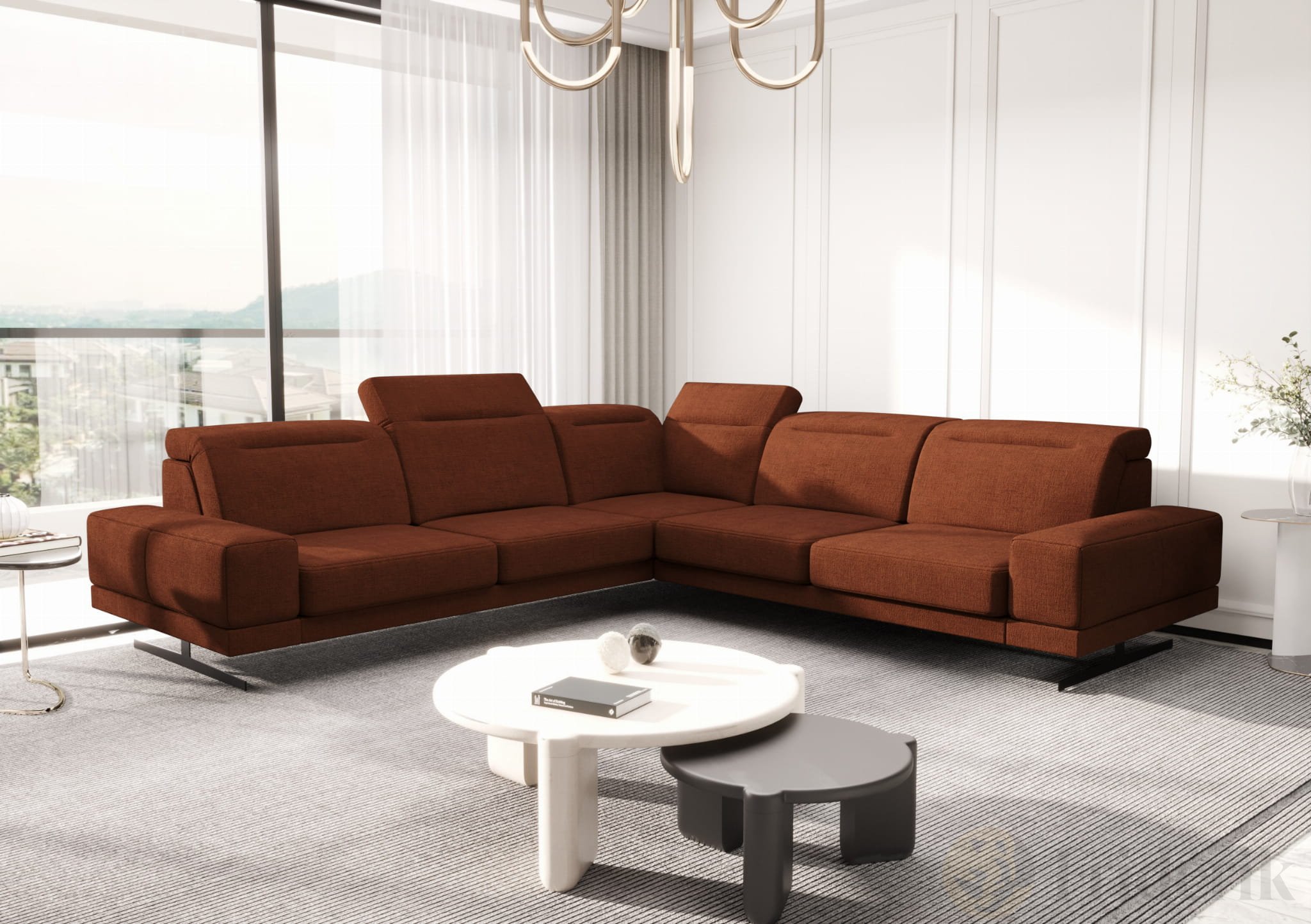 Ecksofa Fiore Max 265x265 cm mit T35 Schaum & Wellenfederung – modernes Ecksofa mit verstellbaren Kopfstützen, Moly 54 - Ziegel Orange