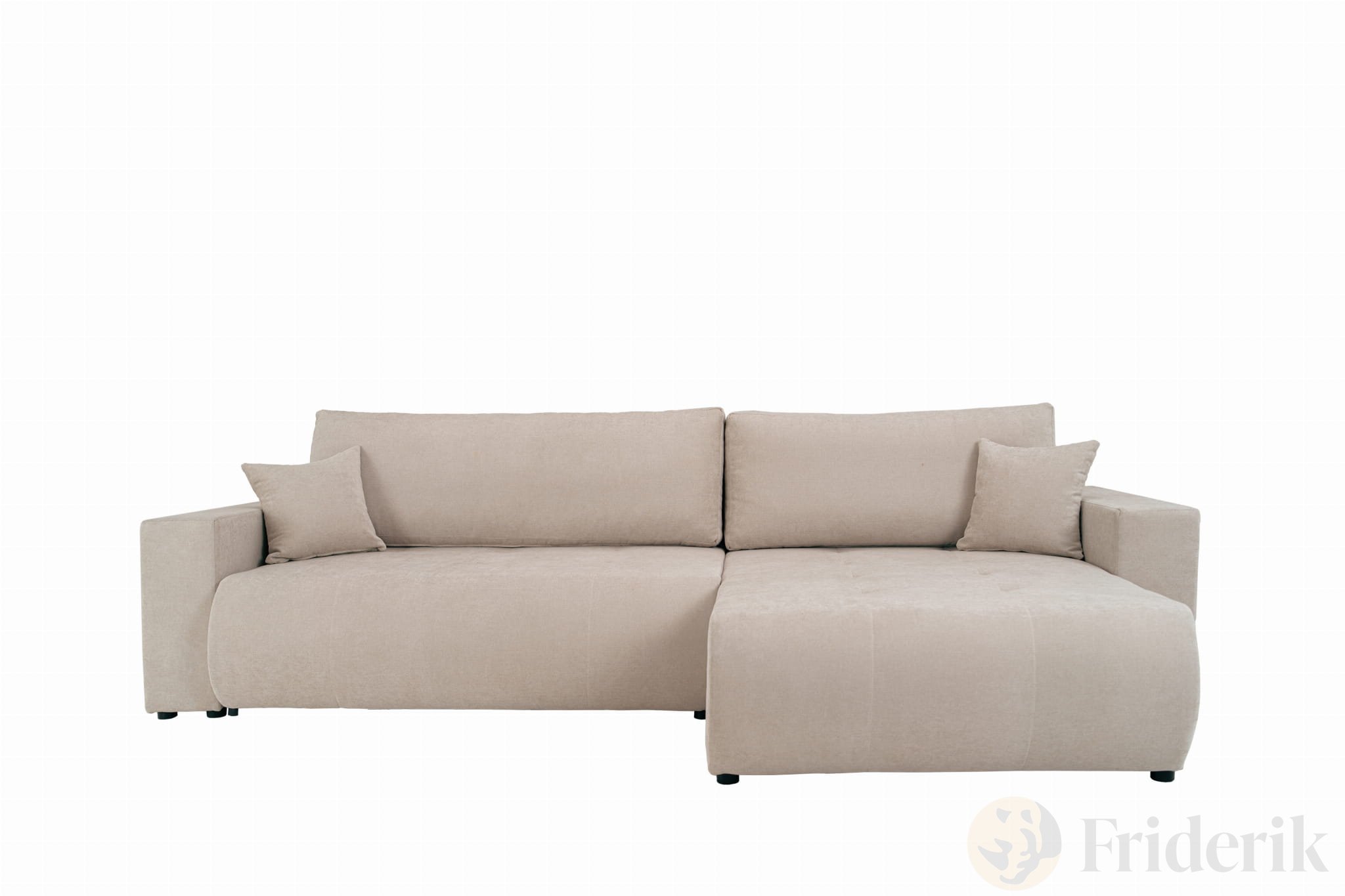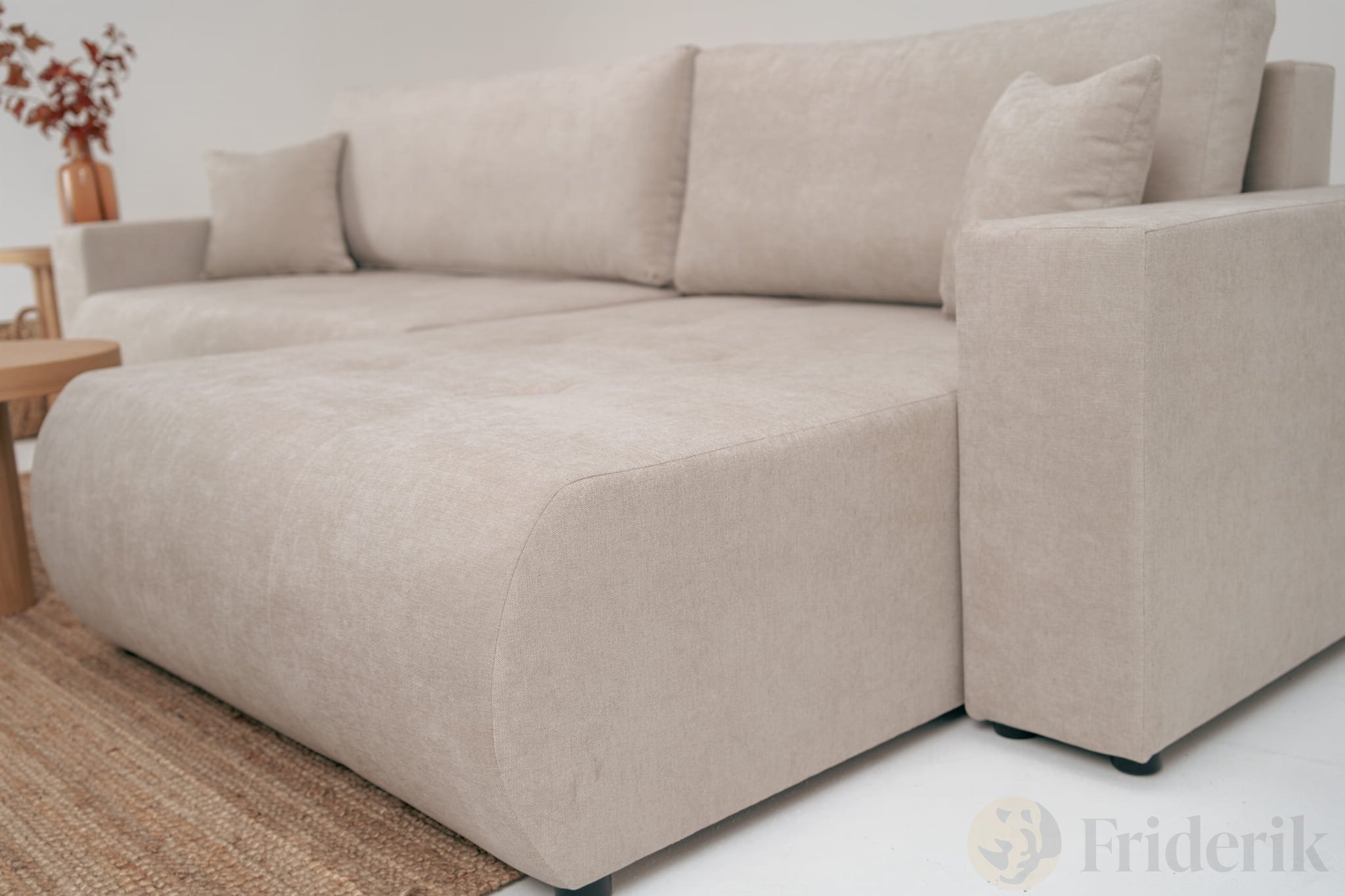 Dank der praktischen Schlaffunktion, der großzügigen Sitzfläche und des minimalistischen Designs wird KORA zum perfekten Ort für entspannte Nachmittage, Treffen mit Familie und Freunden sowie für komfortable Gästebetten. Dieses Ecksofa passt sich Ihrem Tagesablauf an.