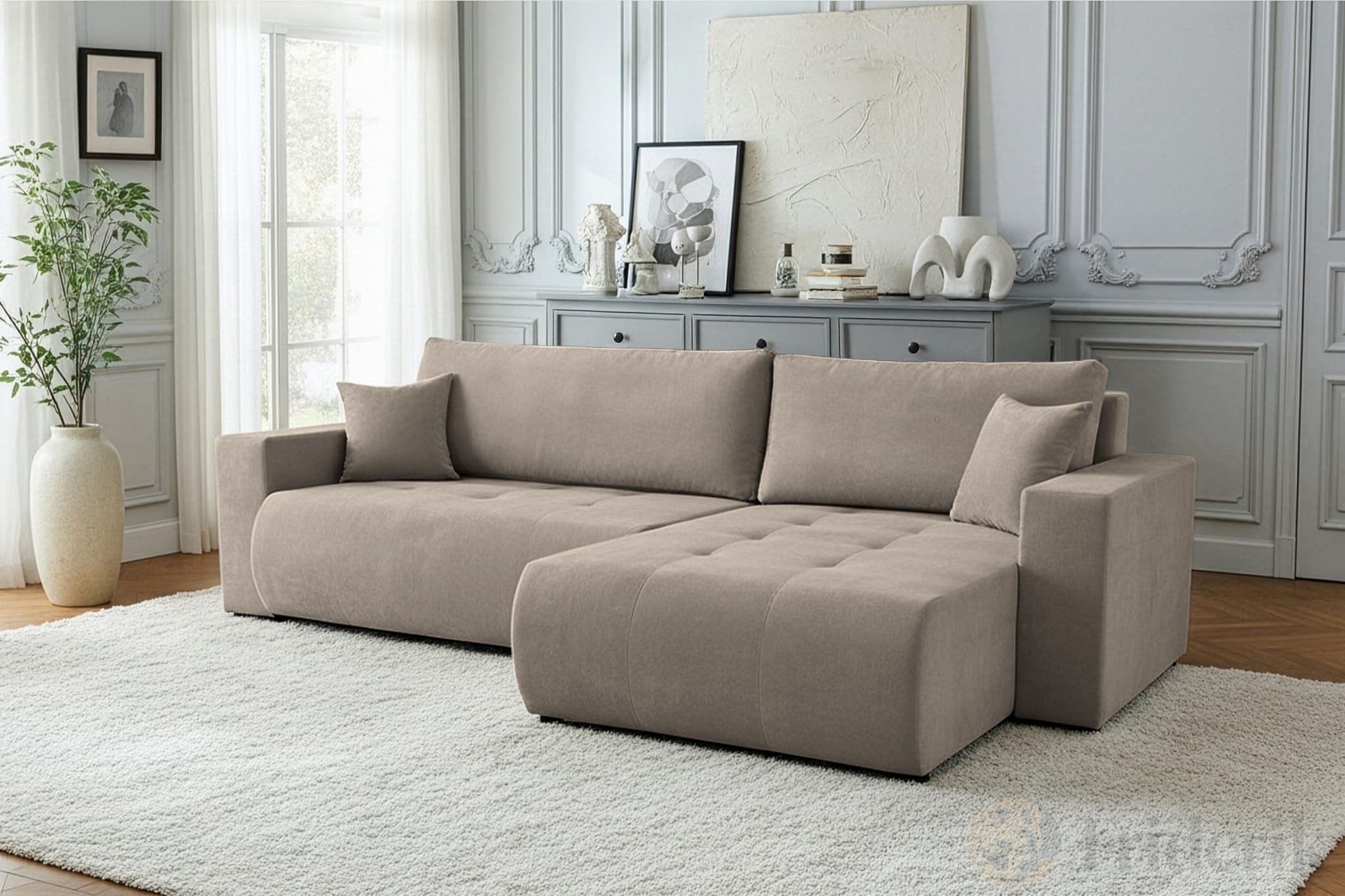 Dank der praktischen Schlaffunktion, der großzügigen Sitzfläche und des minimalistischen Designs wird KORA zum perfekten Ort für entspannte Nachmittage, Treffen mit Familie und Freunden sowie für komfortable Gästebetten. Dieses Ecksofa passt sich Ihrem Tagesablauf an.