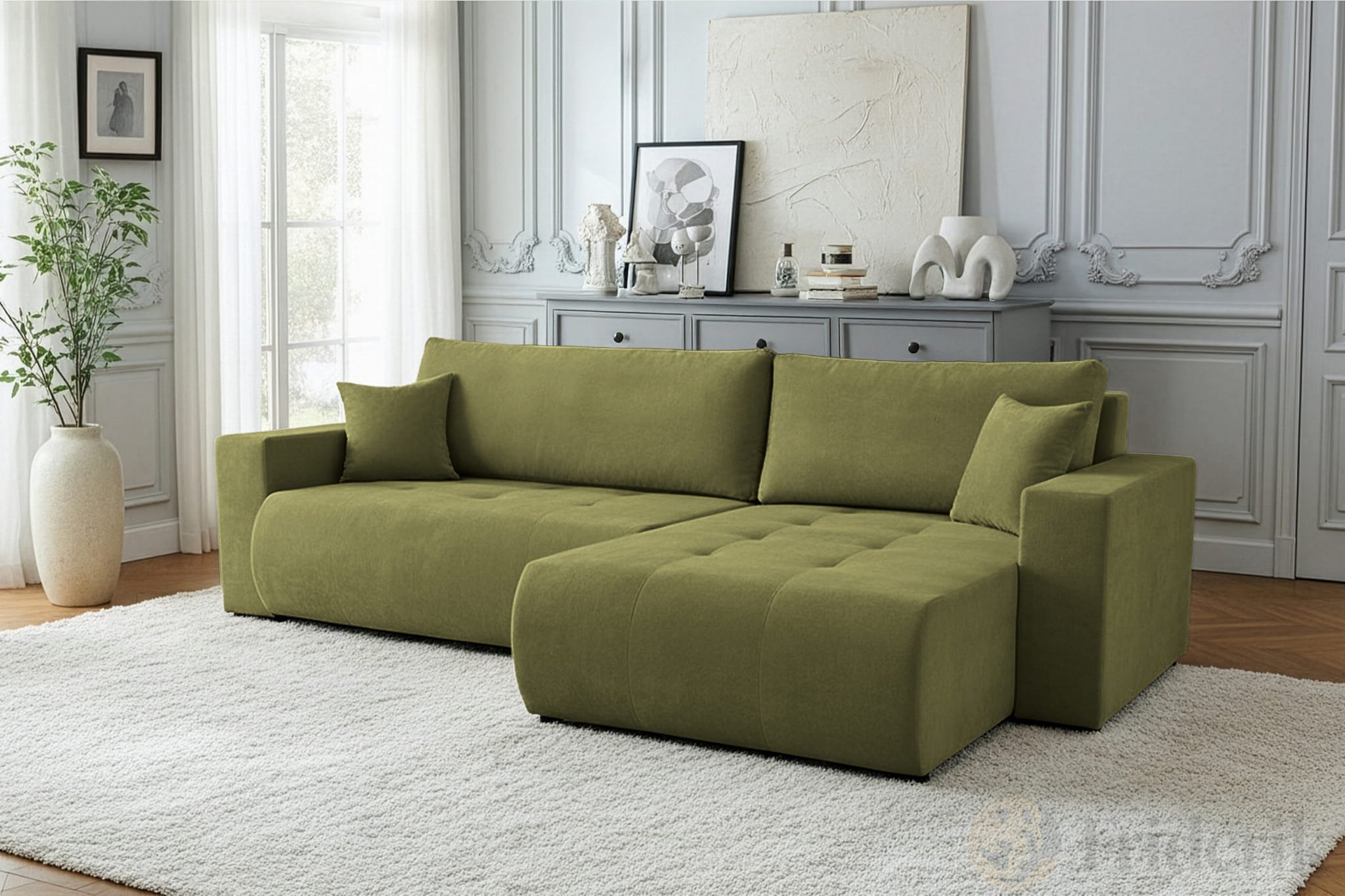 Ecksofa KORA – Modernes, komfortables Sofa mit Schlaffunktion und Stauraum für Wohnzimmer - Olivgrün (Wind 34)