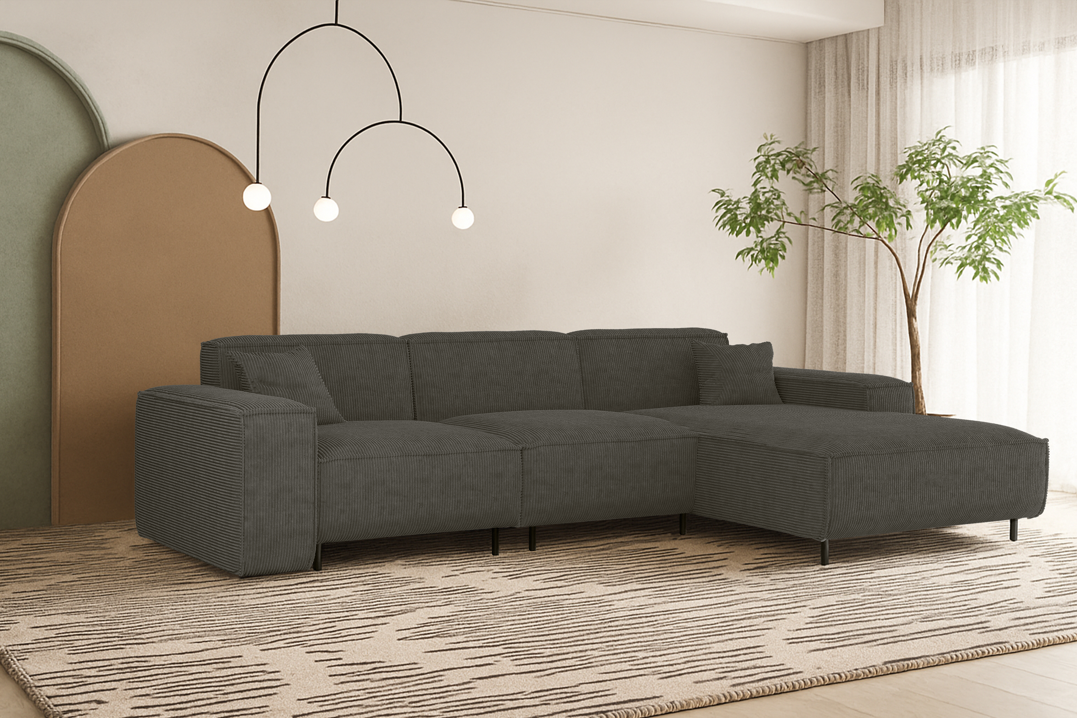 Ob als zentraler Blickfang im Wohnzimmer oder frei im Raum platziert – LUGA L HILLS überzeugt durch ausgewogene Proportionen, hochwertige Verarbeitung und ein zeitloses Erscheinungsbild. Dieses Sofa schafft eine Atmosphäre der Ruhe und lädt zu entspannten Momenten mit Familie und Freunden ein.