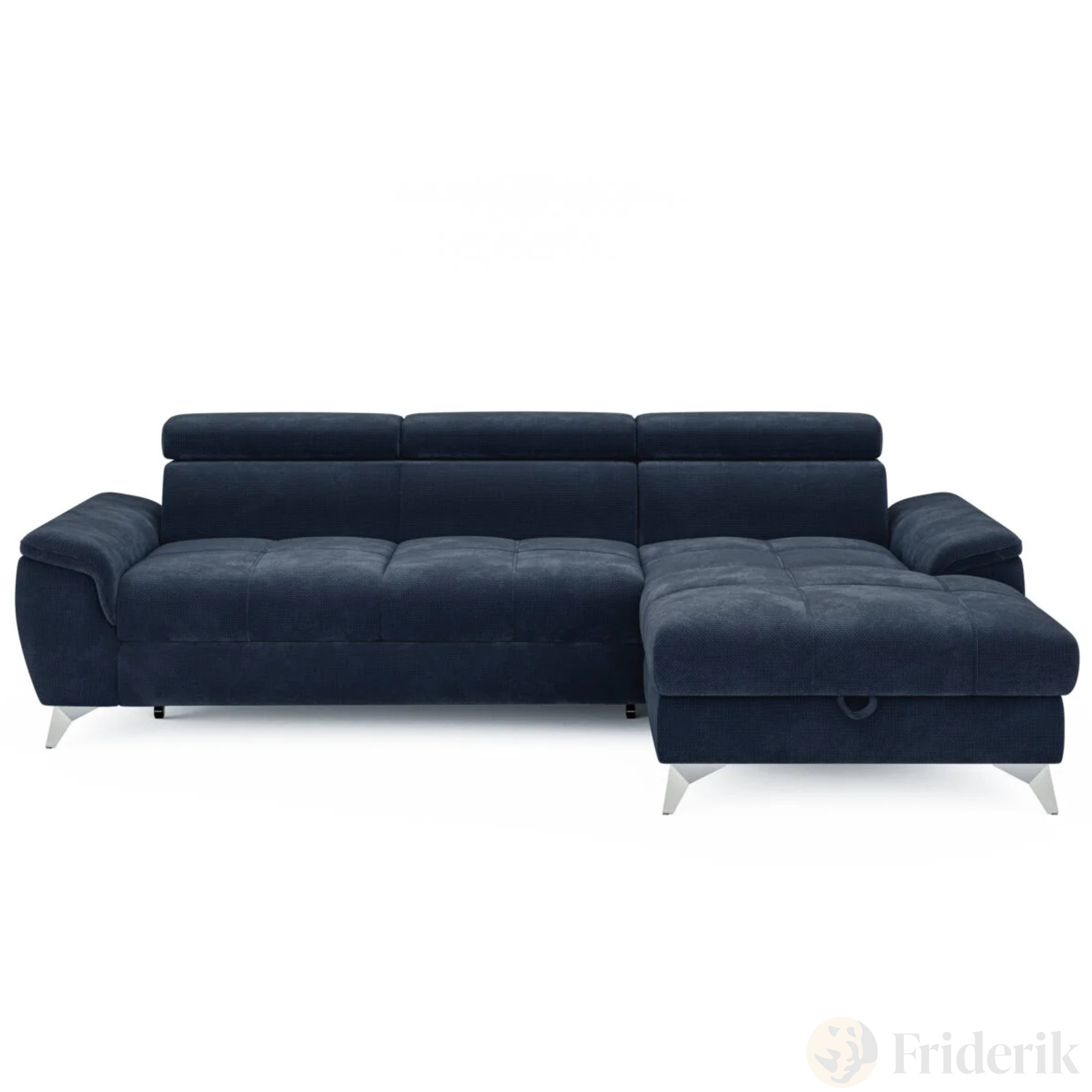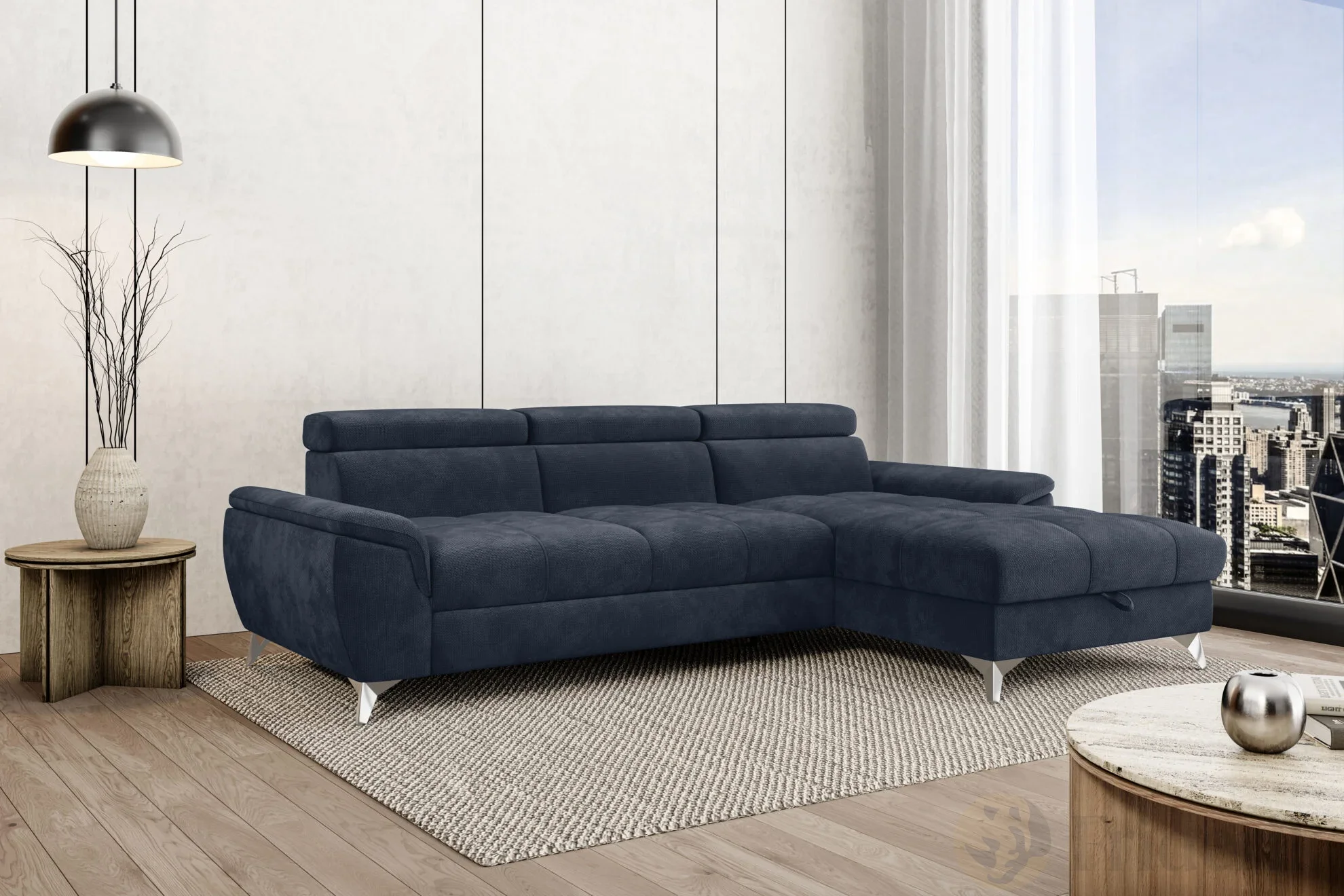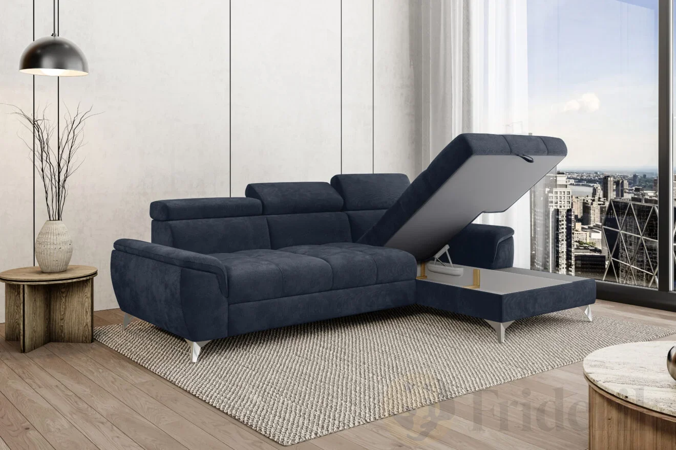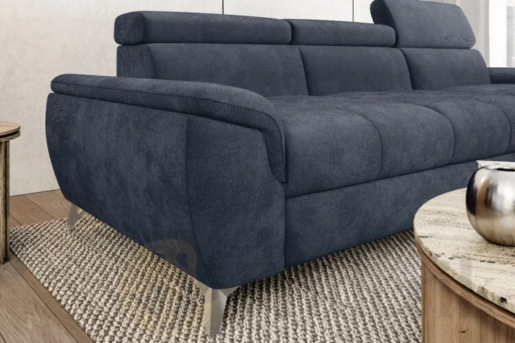 Ecksofa LUGANO mit Schlaffunktion, Bettkasten und verstellbaren Kopfstützen – Stoff Eden 16, Dunkelblau