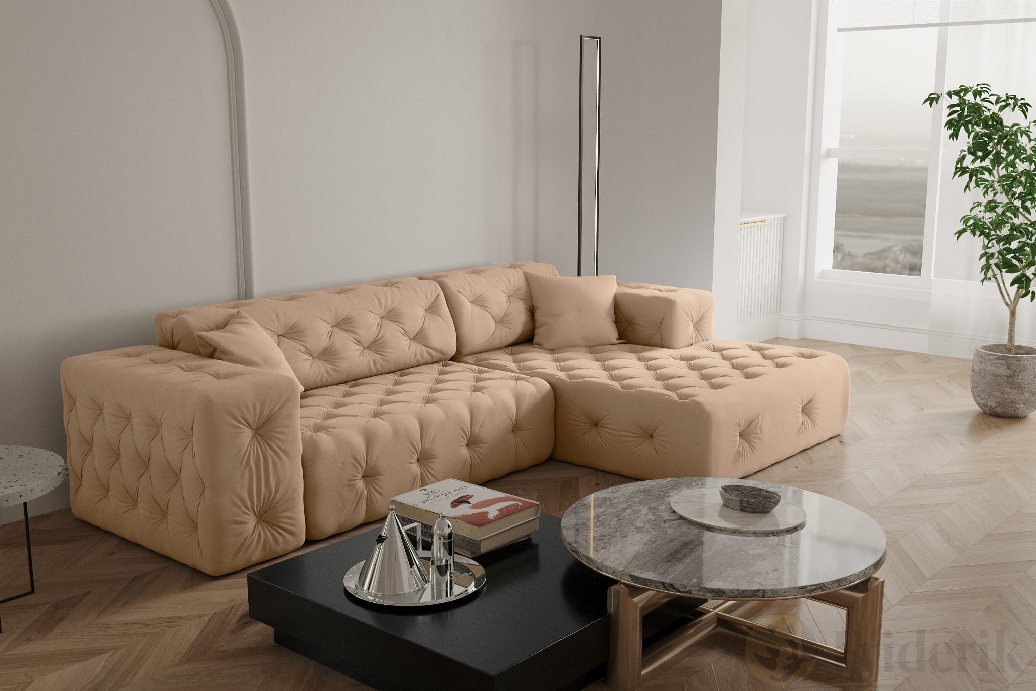 Stellen Sie sich einen perfekten Nachmittag vor: gemütlich entspannen, eingehüllt in den weichen Samtstoff „Opera“, umgeben von modernem Chesterfield-Stil und einem Hauch von Luxus. Das L-förmige Ecksofa MODEST verbindet erstklassigen Komfort mit elegantem Design und robuster Verarbeitung – ideal für Familien mit Kindern und Haustieren. Mit einer Sitzfläche von 60 cm Tiefe, breiten Armlehnen und dekorativen Kissen wird Ihr Wohnzimmer zur Wohlfühloase. Dank der großzügigen Maße von 266 x 165 x 73 cm passt sich das Sofa perfekt Ihrem Raum an und bietet dank der breiten Ottomane zusätzlichen Platz zum Relaxen. Erleben Sie Möbel, die nicht nur gut aussehen, sondern auch ein echtes Zuhause schaffen.