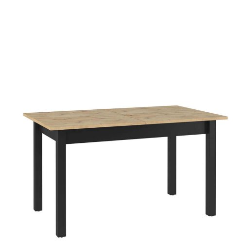 Ausziehbarer Tisch im modernen Stil. Schwarze, schlanke Beine kombiniert mit einer Platte, die natürliches Holz imitiert. Die Möbel bestehen aus einer haltbaren laminierten Platte, die mit einer haltbaren ABS-Kante versehen ist.
