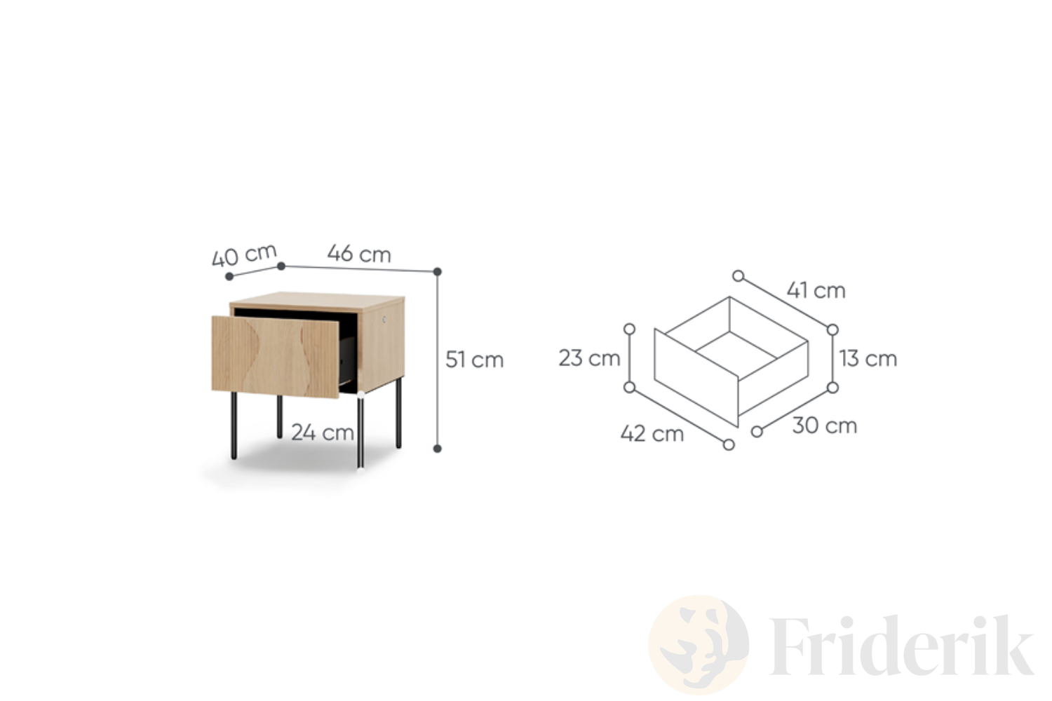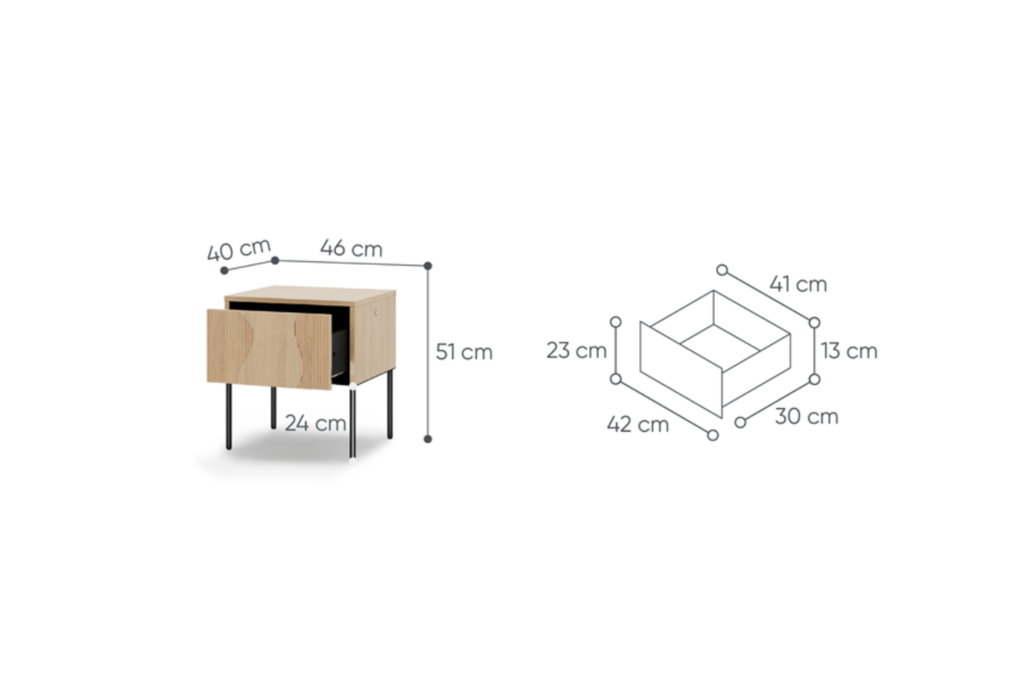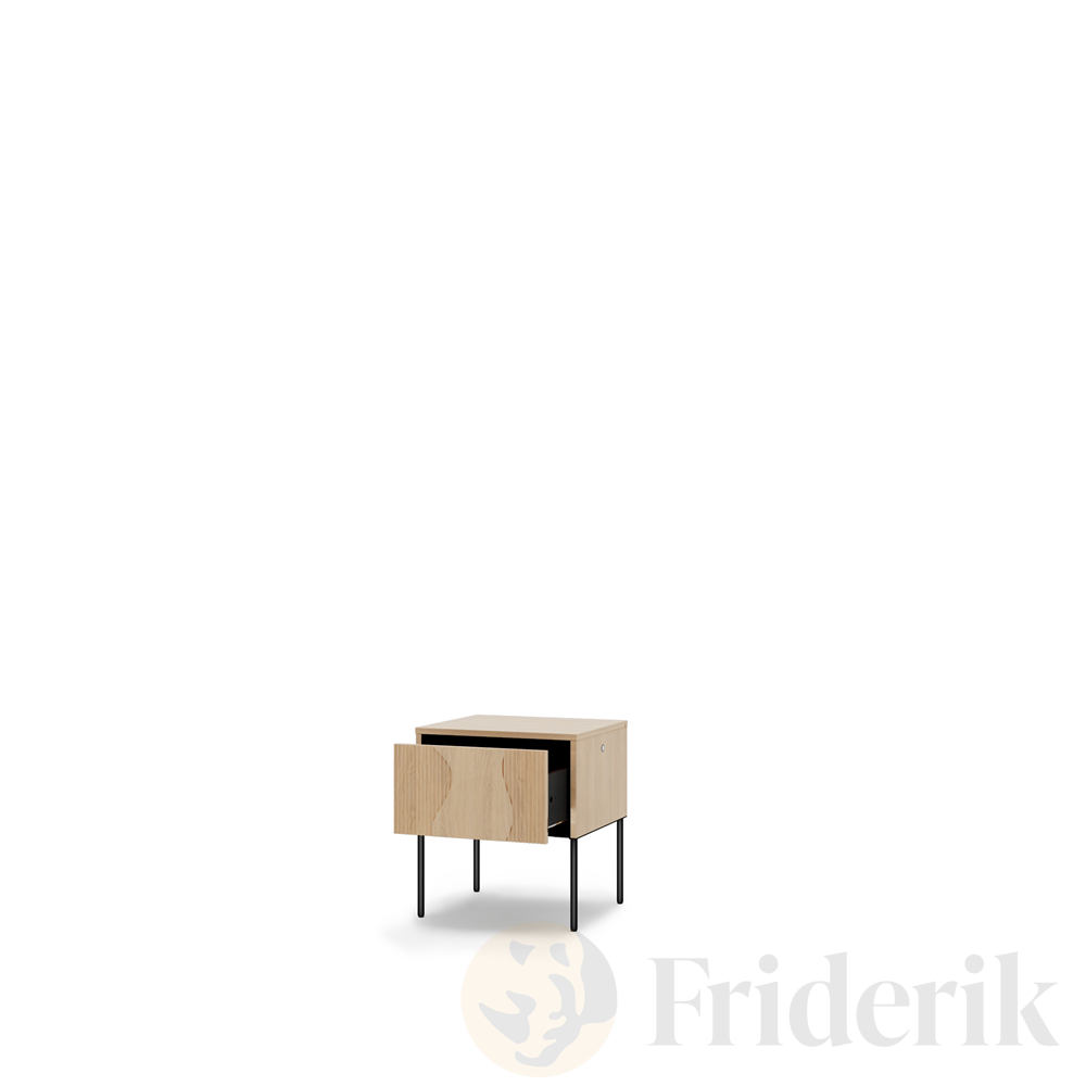 Die Kombination aus Eiche Vincenza gebleicht und Schwarz verleiht dem Möbelstück eine ruhige, zeitlose Ausstrahlung. Der praktische Tischplatte bietet Platz für Lampe, Buch oder Wecker, während die geräumige Schublade zusätzlichen Stauraum für persönliche Gegenstände schafft. Schlanke, schwarze Metallfüße sorgen für eine leichte, moderne Optik.