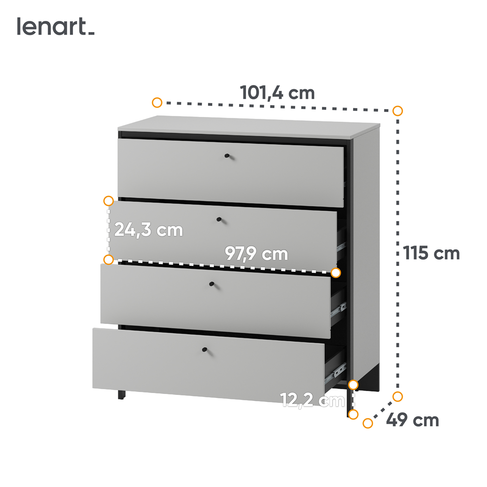 Die Kollektion GRIS von Lenart bietet eine breite Auswahl an eleganten und modernen Möbeln, die speziell für stilvolle Schlafzimmer entworfen wurden. Jedes Möbelstück der Kollektion wurde sorgfältig gestaltet, um Komfort und modernes Design zu vereinen. Die Kommode GRIS ergänzt die Kollektion perfekt und schafft eine harmonische und funktionale Atmosphäre im Raum.