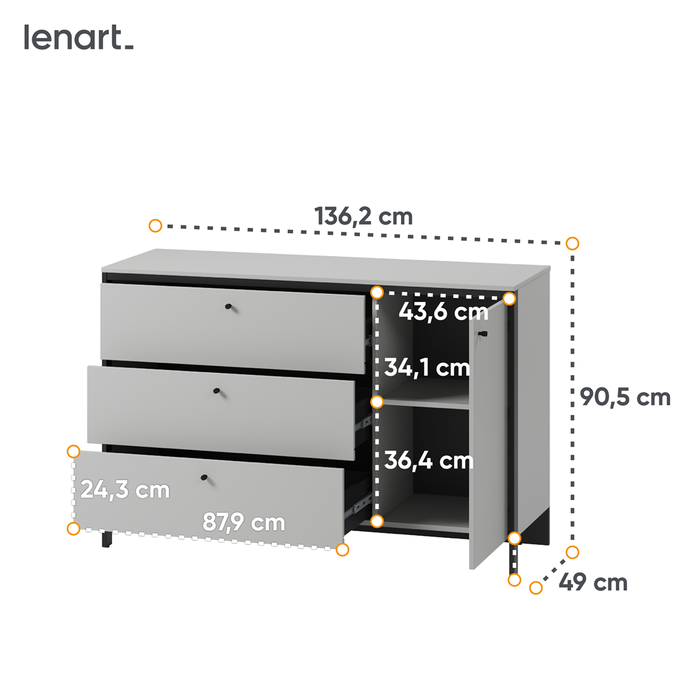 Die Kollektion GRIS von Lenart bietet eine breite Auswahl an stilvollen und modernen Möbeln, die speziell für elegante Schlafzimmer entworfen wurden. Jedes Möbelstück der Kollektion wurde entwickelt, um Komfort und modernes Design zu vereinen. Die Kommode GRIS ergänzt die Kollektion perfekt und schafft eine harmonische und funktionale Atmosphäre im Raum.