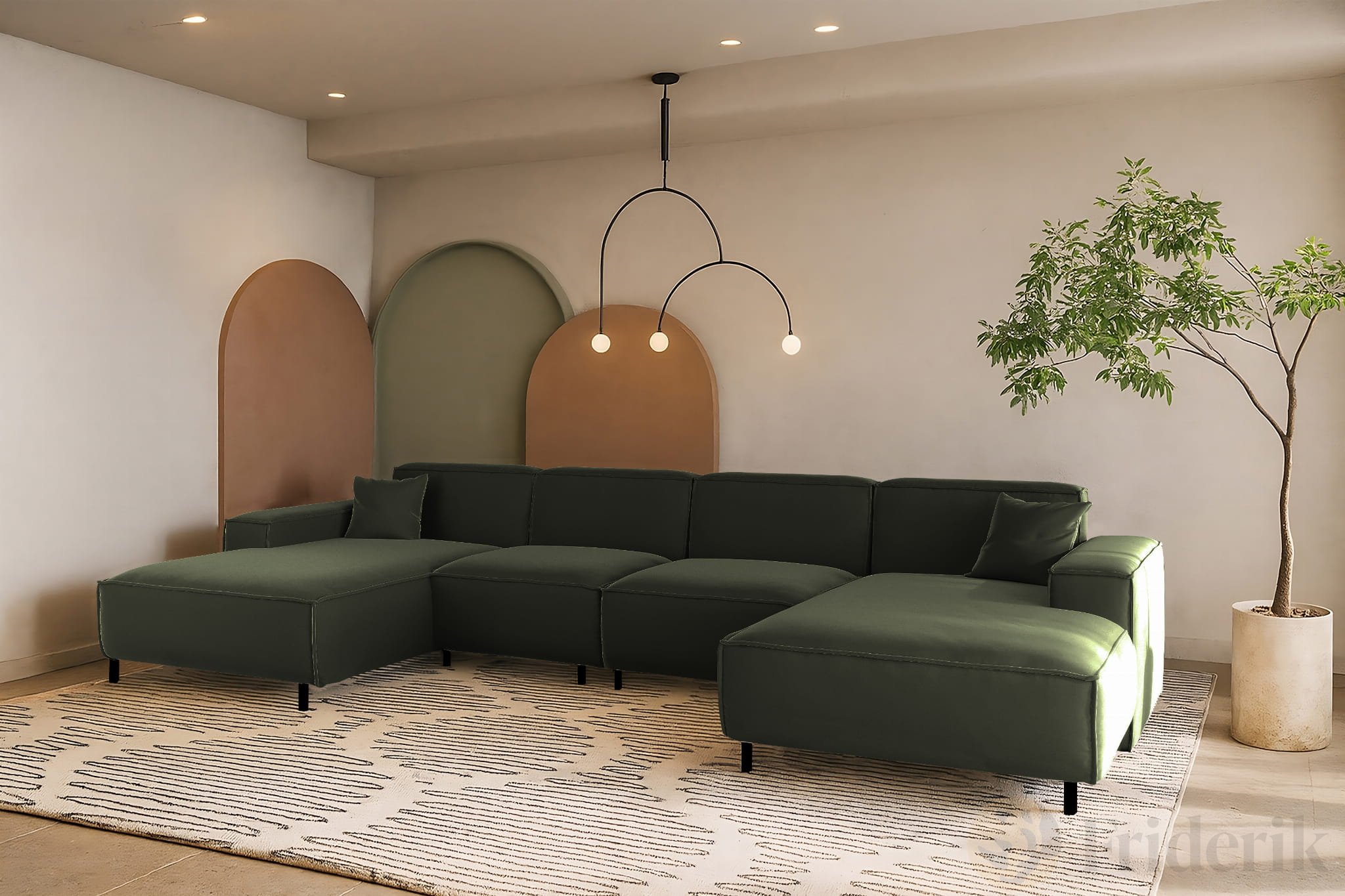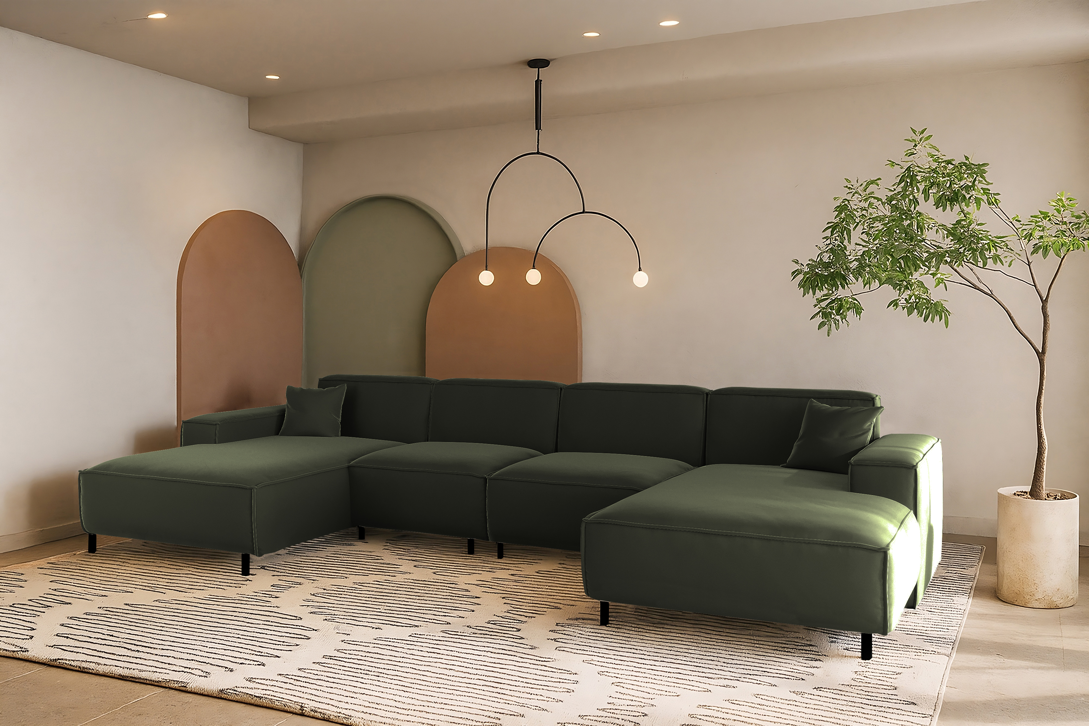 LUGA U HILLS ist ein großzügiges Ecksofa in U-Form, das für moderne, offene Wohnräume entworfen wurde. Klare Linien, ausgewogene Proportionen und breite Sitzflächen machen dieses Sofa zum natürlichen Mittelpunkt des Wohnzimmers.