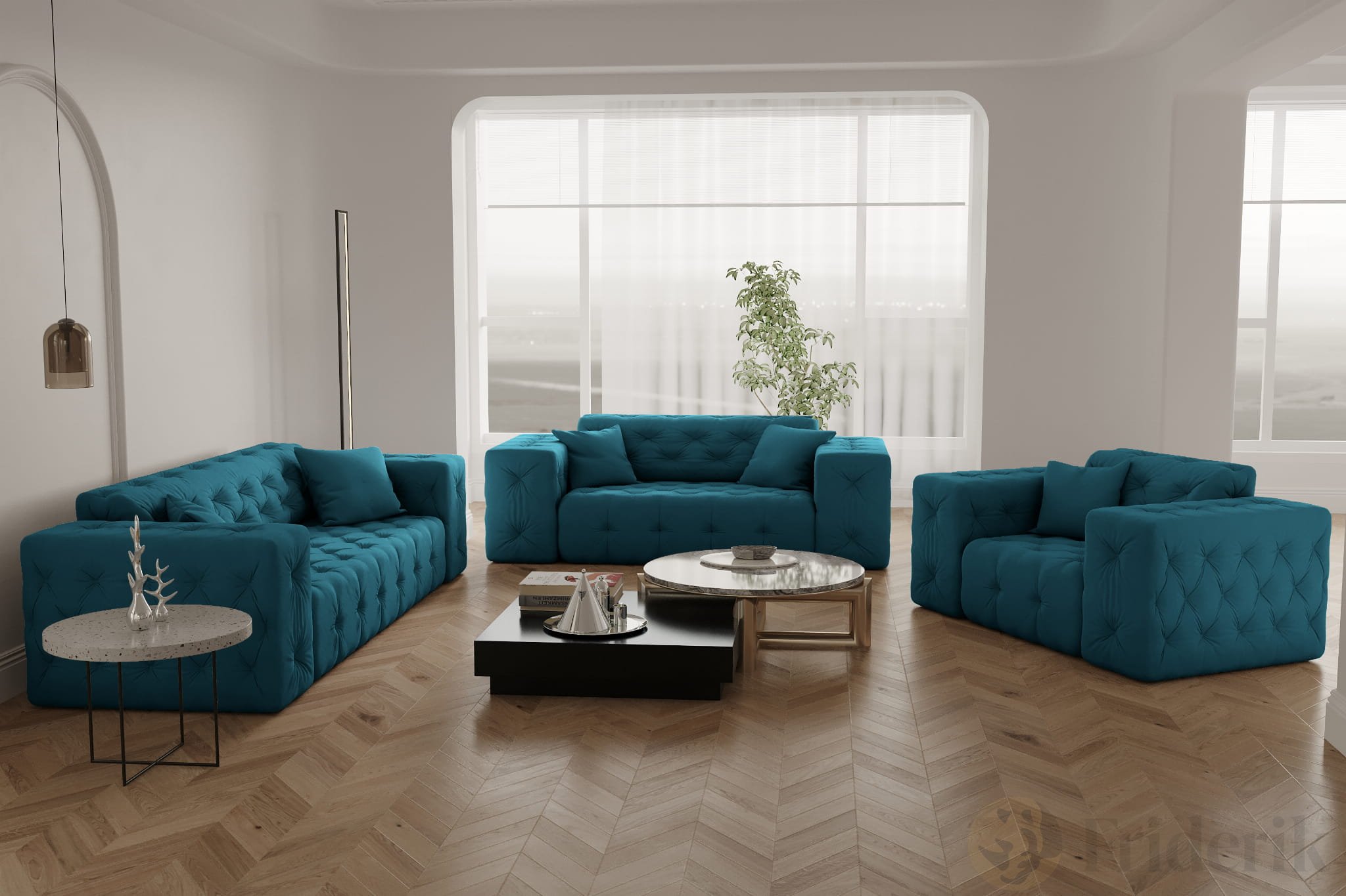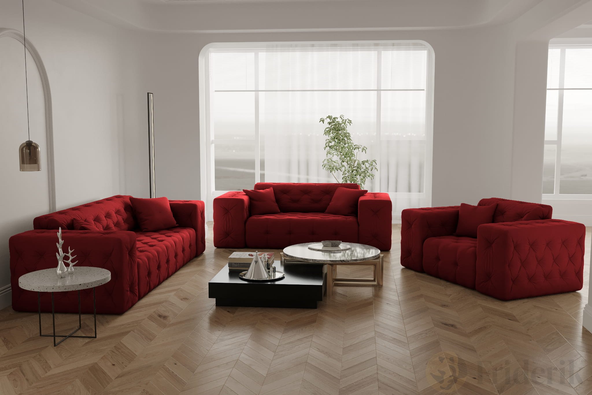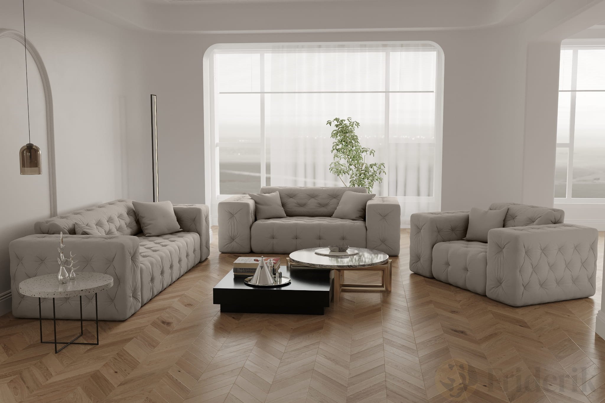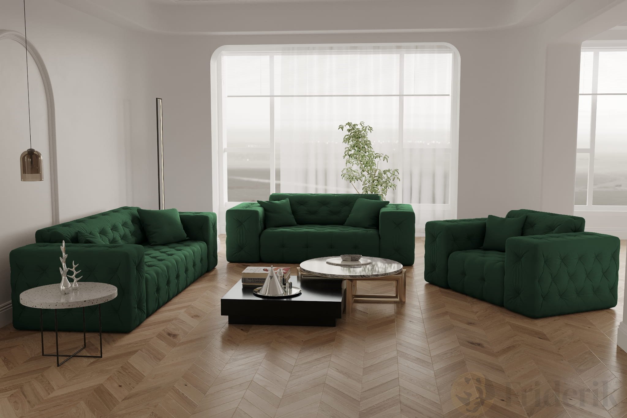 Stellen Sie sich einen entspannten Abend vor, an dem Sie in Ihrem stilvollen Wohnzimmer Platz nehmen – umgeben von weichem Samt, eleganten Nähten im Chesterfield-Stil und einem Möbelset, das sich flexibel an Ihre Raumgestaltung anpasst. Das MODEST Möbelset vereint ein 3-Sitzer-Sofa, ein 2-Sitzer-Sofa und einen Sessel, die Sie frei arrangieren können. Dank der tiefen Sitzflächen und breiten Armlehnen erleben Sie höchsten Komfort, während die dekorativen Kissen eine gemütliche Atmosphäre schaffen. Dieses Set ist die perfekte Antwort für alle, die Design, Funktionalität und Langlebigkeit in einem Möbelstück suchen.