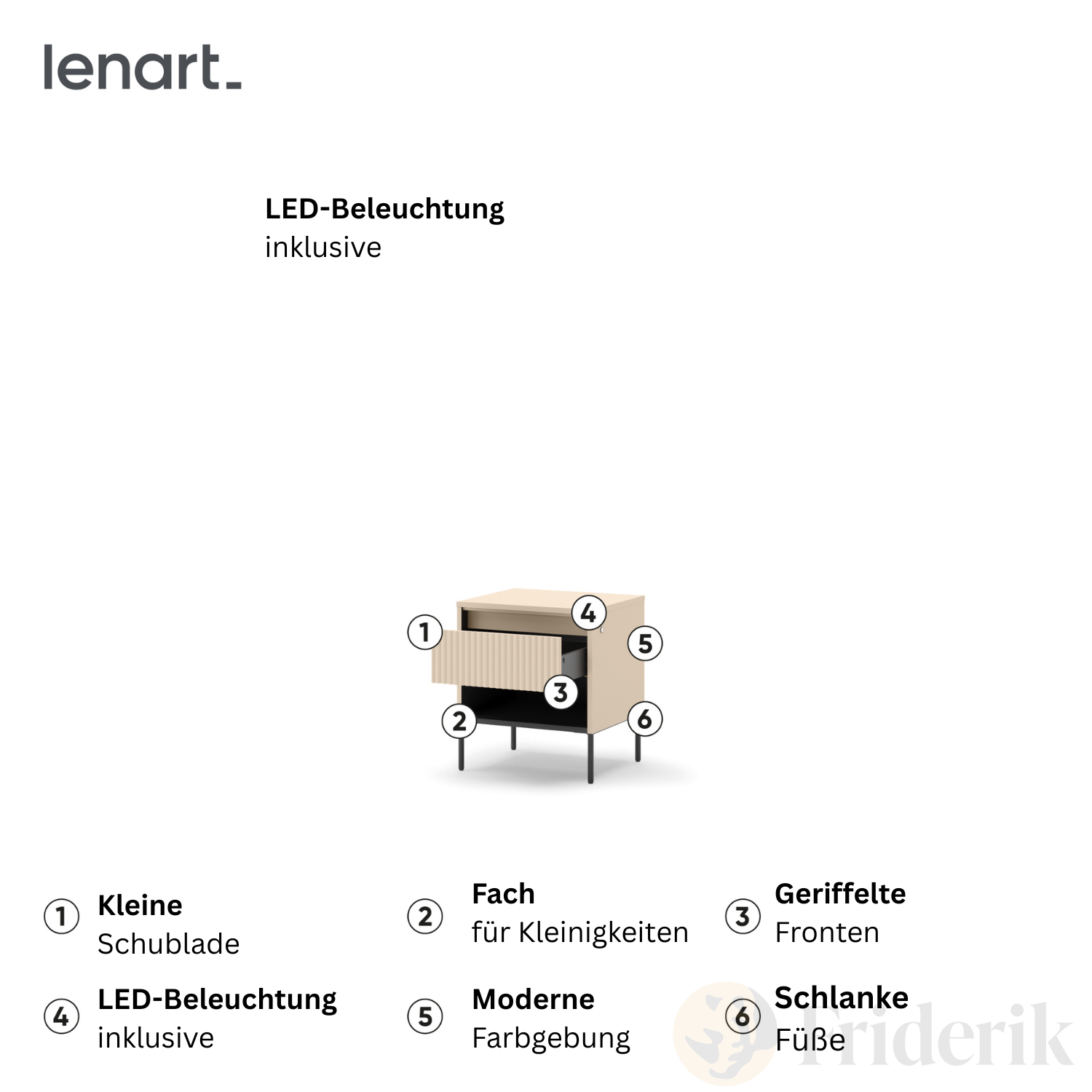 Suchen Sie nach einem Nachttisch, der perfekt in Ihr modernes Schlafzimmer passt? Der Trend Schlafzimmer TS-10 ist die Antwort auf Ihre Wünsche. Die schmalen Füße verleihen dem Möbelstück Leichtigkeit und Modernität, während die LED-Beleuchtung der Energieeffizienzklasse A++ für eine angenehme Atmosphäre sorgt.