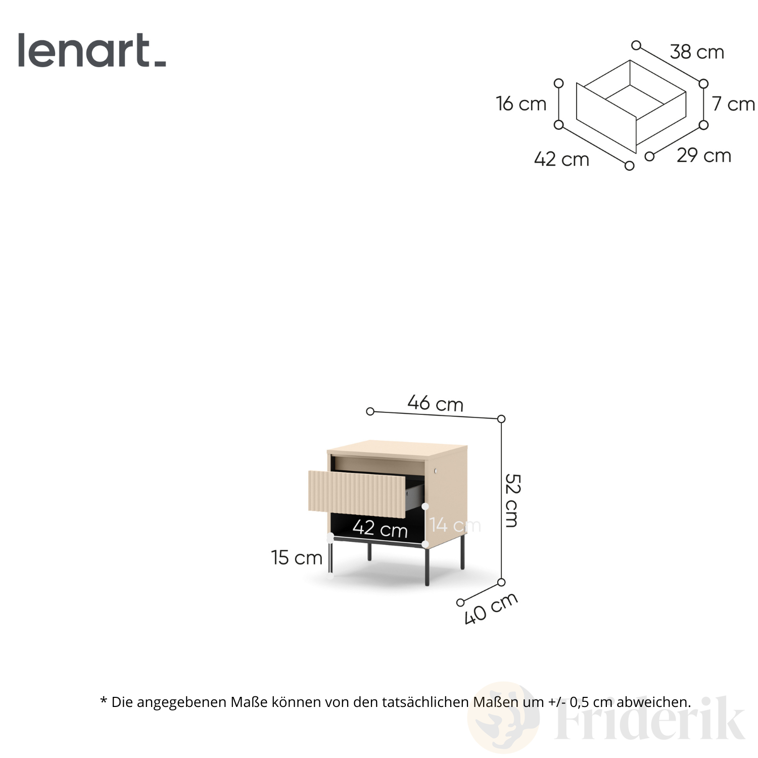 Material: Korpus und Tischplatte: Laminierte Spanplatte 16 mm, Front: MDF 18 mm