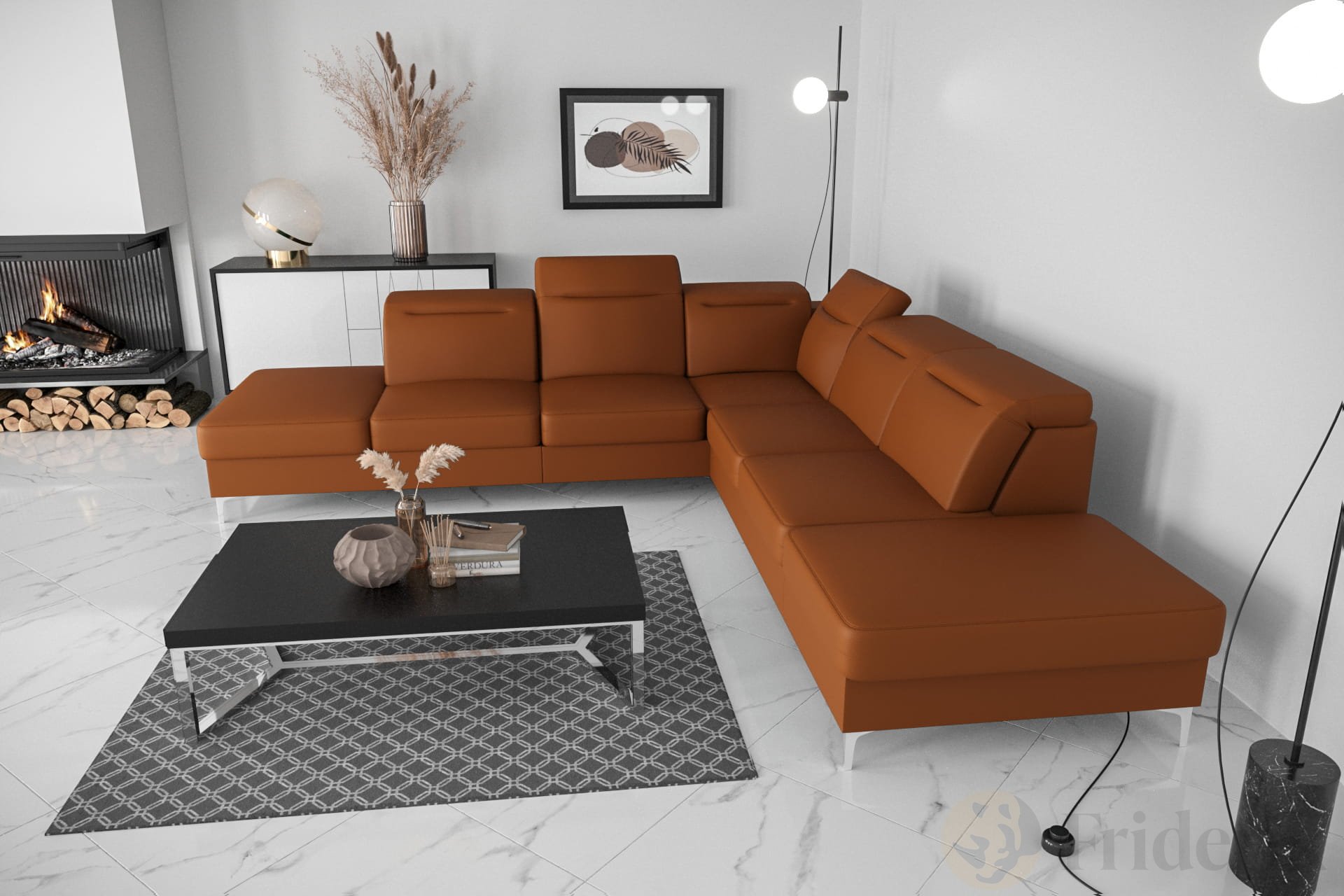 OSLO MAX Ecksofa 295x295 cm aus Naturleder mit Schlaffunktion und verstellbaren Kopfstützen - Echtleder L-9, Kupferrot