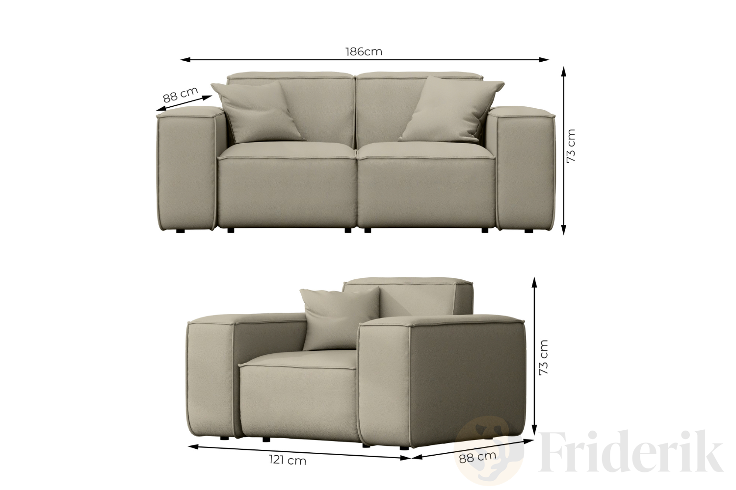 - 2-Sitzer-Sofa: 186 cm (Breite) x 88 cm (Tiefe) x 73 cm (Höhe)