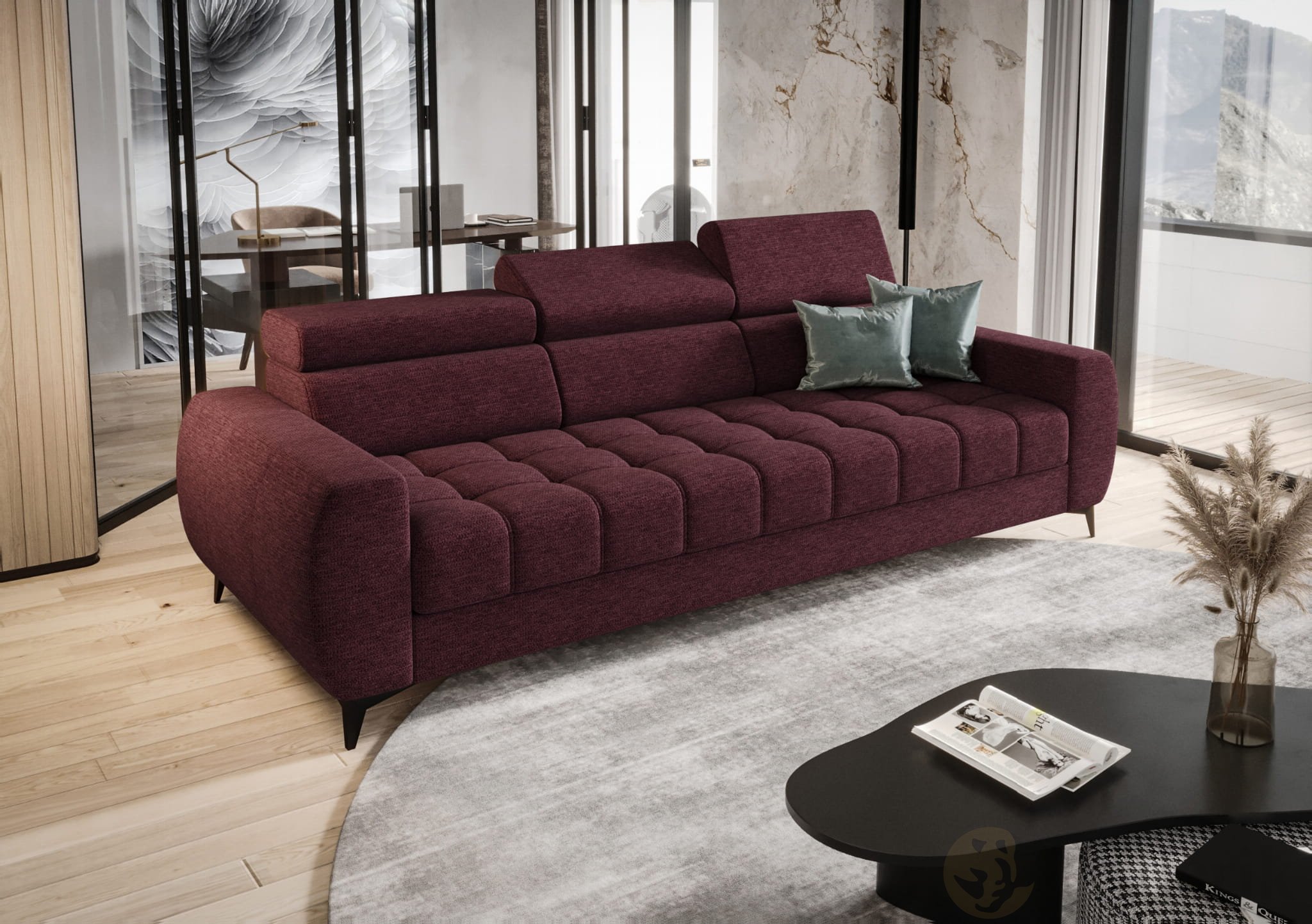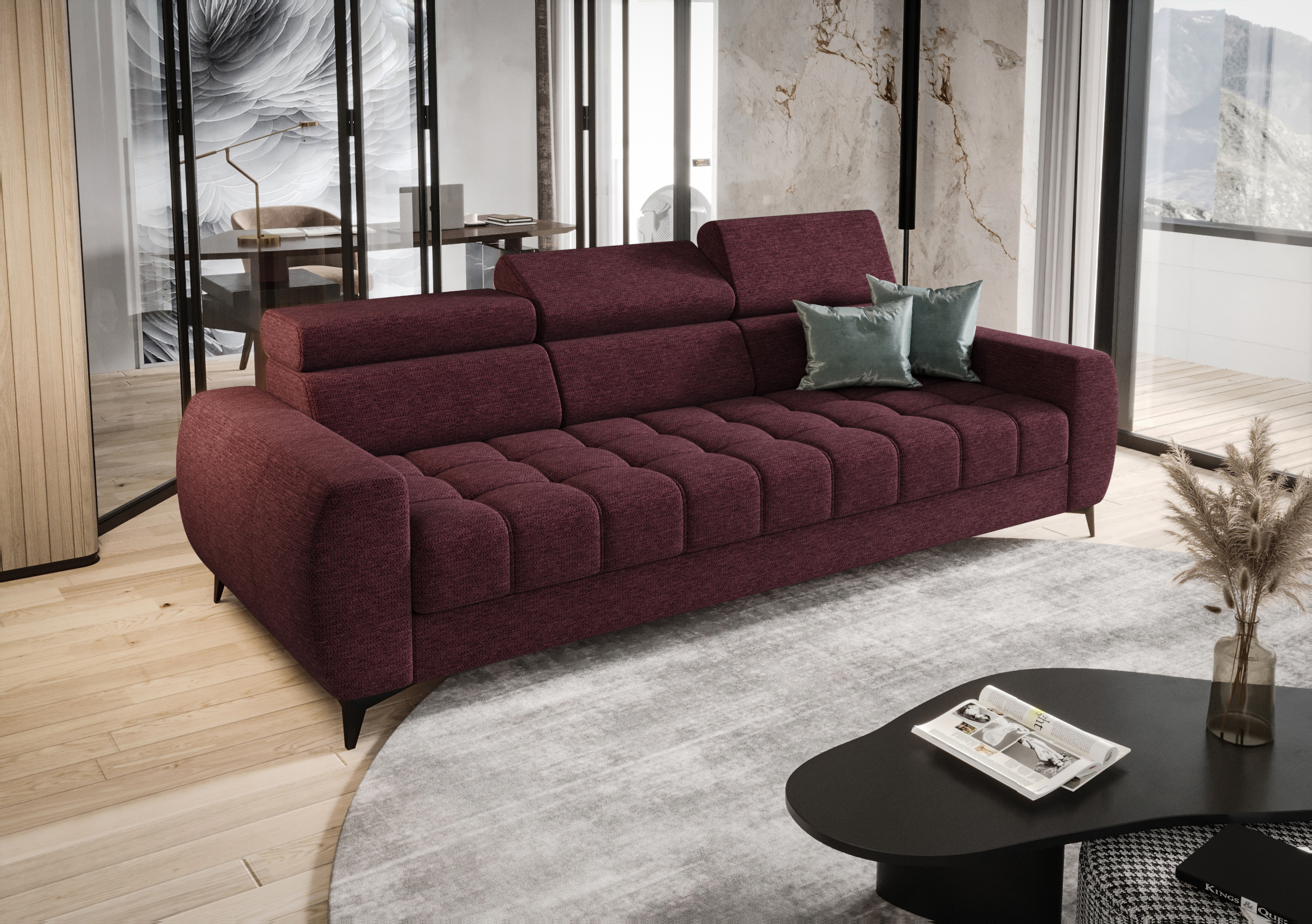PORTO III 260 cm – Design-Sofa mit verstellbaren Kopfstützen, HR-Schaum, Wellenfedern - Crown 06, Burgund