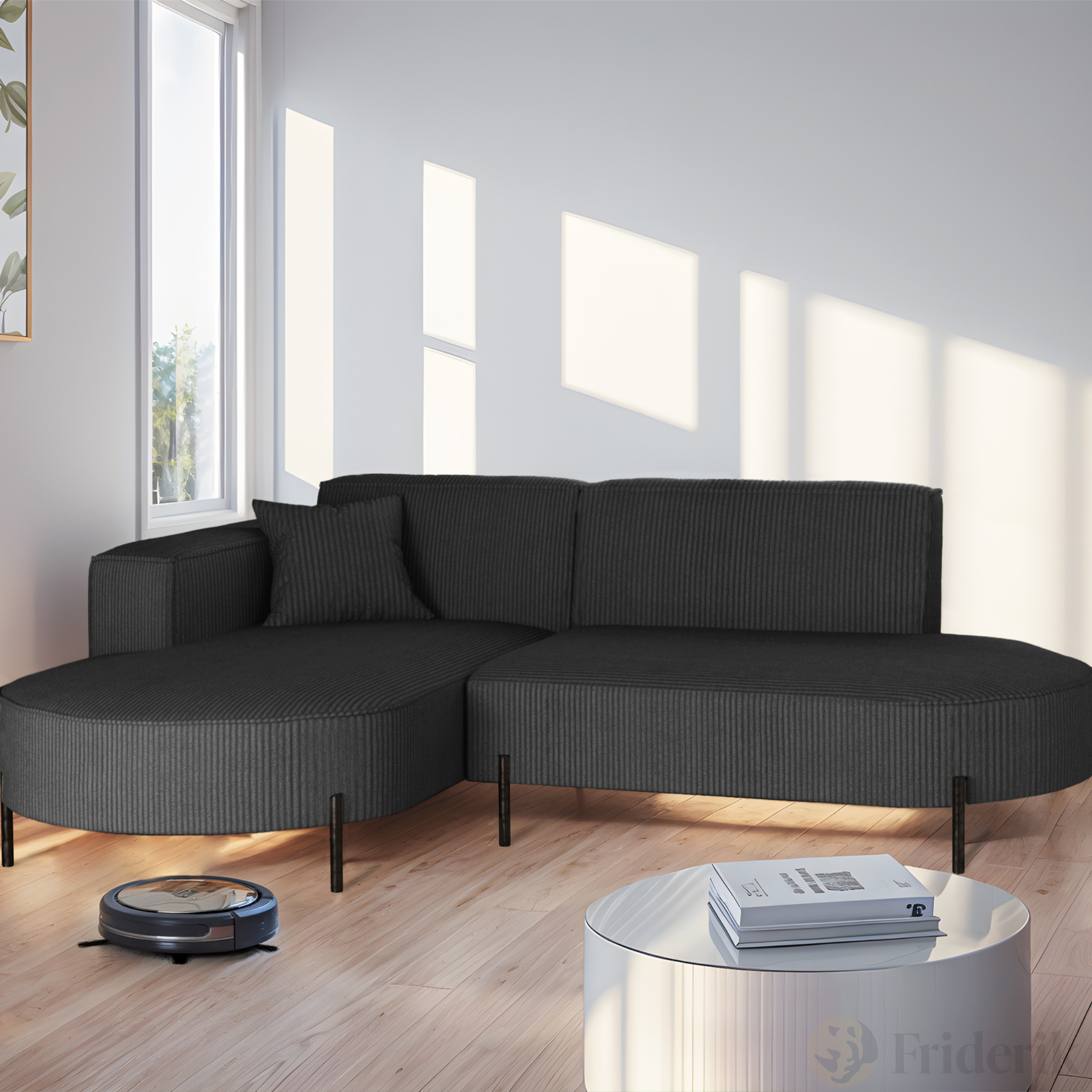 Praktisch & flexibel: Rückseite mit Stoff bezogen – frei im Raum platzierbar; einfache Reinigung dank freiem Raum unter den Füßen.