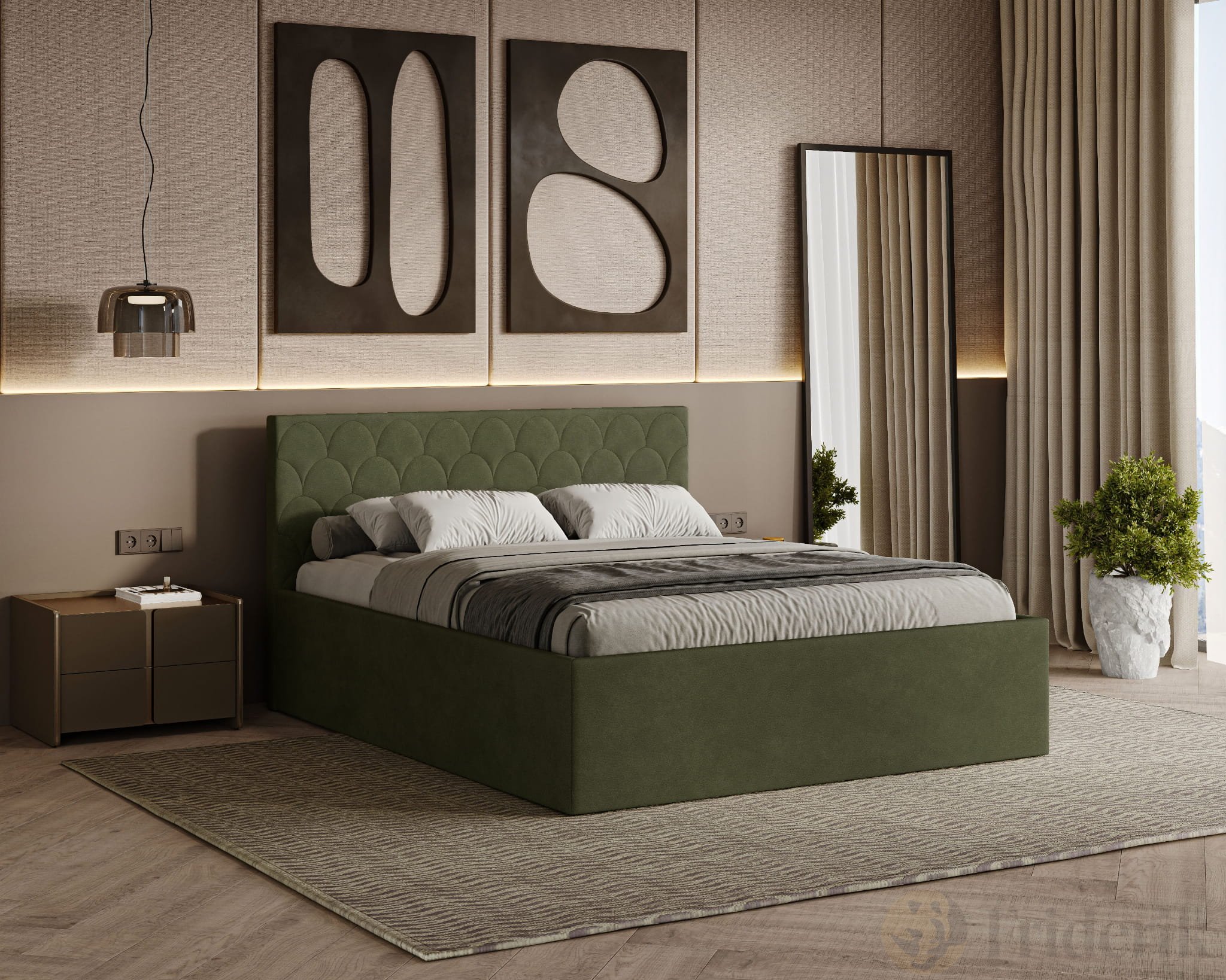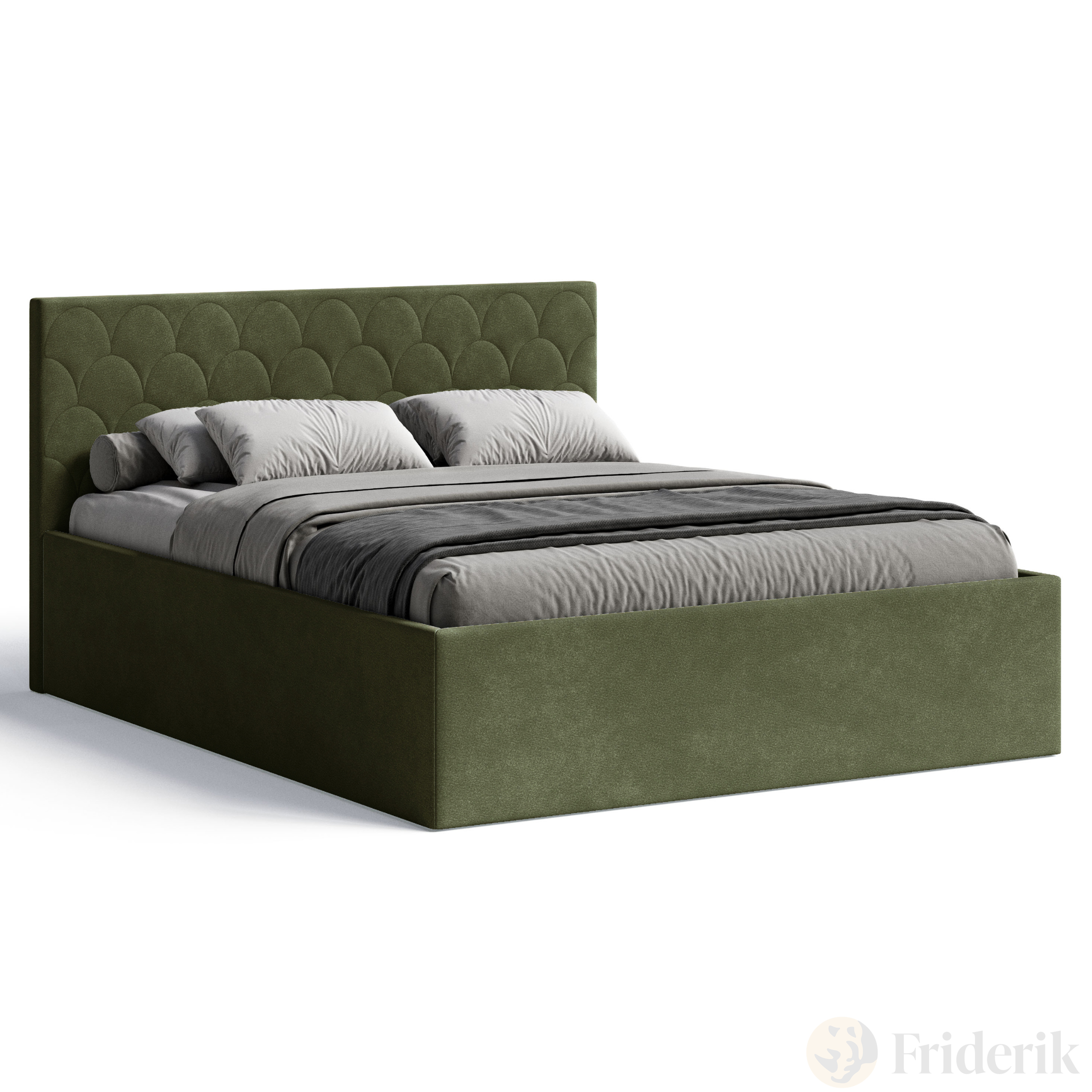Polsterbett Radius 160x200 cm – modernes Doppelbett mit Bettkasten & gepolstertem Kopfteil - Olive (Noble 38)