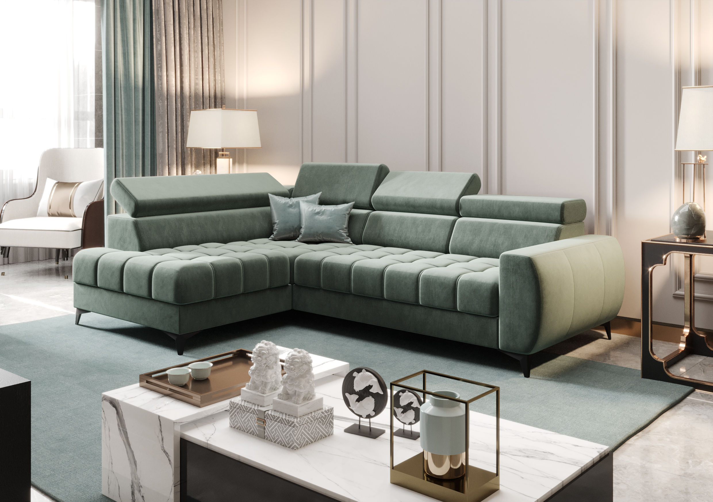 Porto Mini Ecksofa mit Schlaffunktion, verstellbaren Kopfstützen und Bettkasten – Terra 72, Türkis