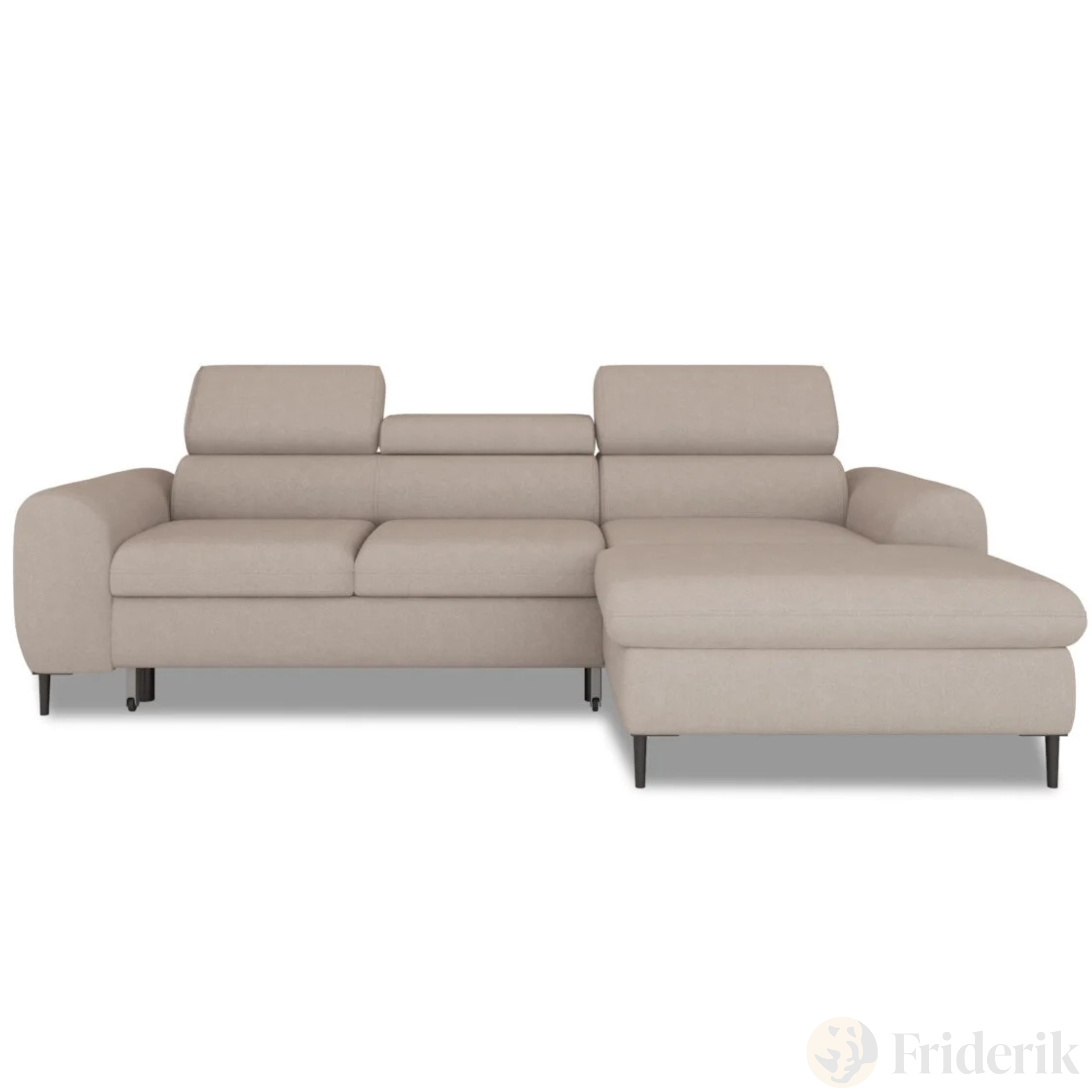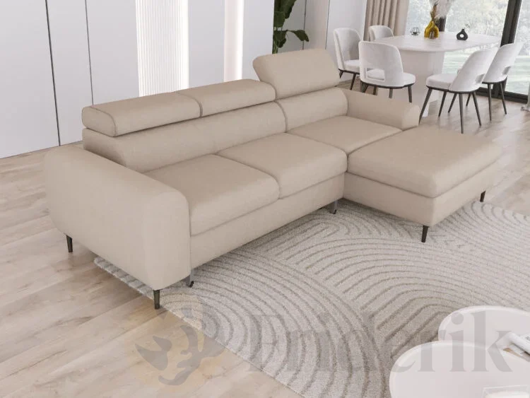 RAYO S – funktionales Ecksofa mit Delfin-Schlaffunktion, geräumigem Bettkasten und verstellbaren Kopfstützen - Beige