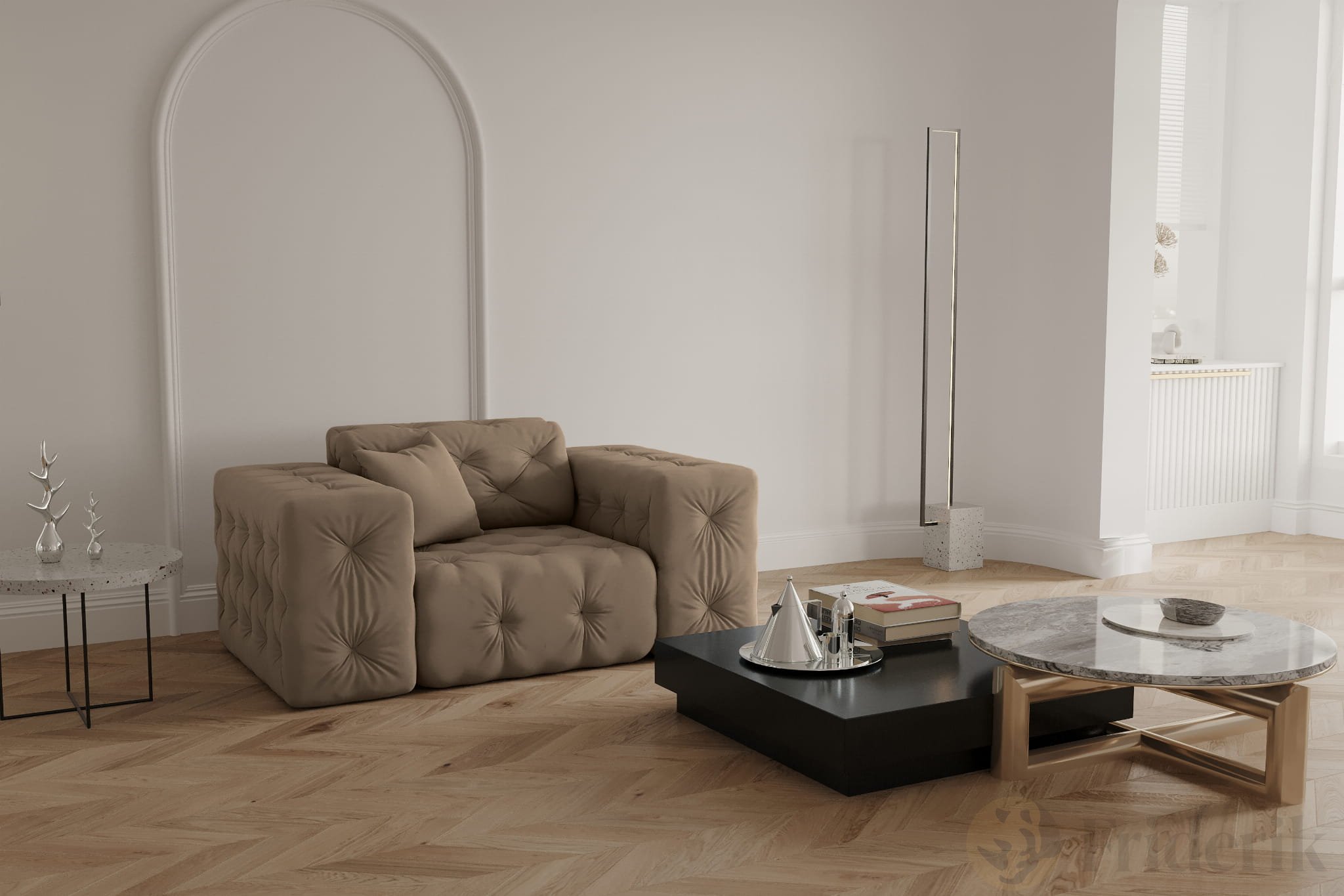 Stellen Sie sich einen ruhigen Abend in Ihrem Wohnzimmer vor. Ein gutes Buch, ein Glas Wein, und ein Sessel, der nicht nur bequem ist, sondern auch sofort ins Auge fällt. Der Sessel Modest verbindet elegantes Chesterfield-Design mit modernem Samtstoff und macht jeden Raum zu etwas Besonderem. Mit seinen breiten Armlehnen, der tiefen Sitzfläche und einem dekorativen Kissen lädt er zu purer Entspannung ein.