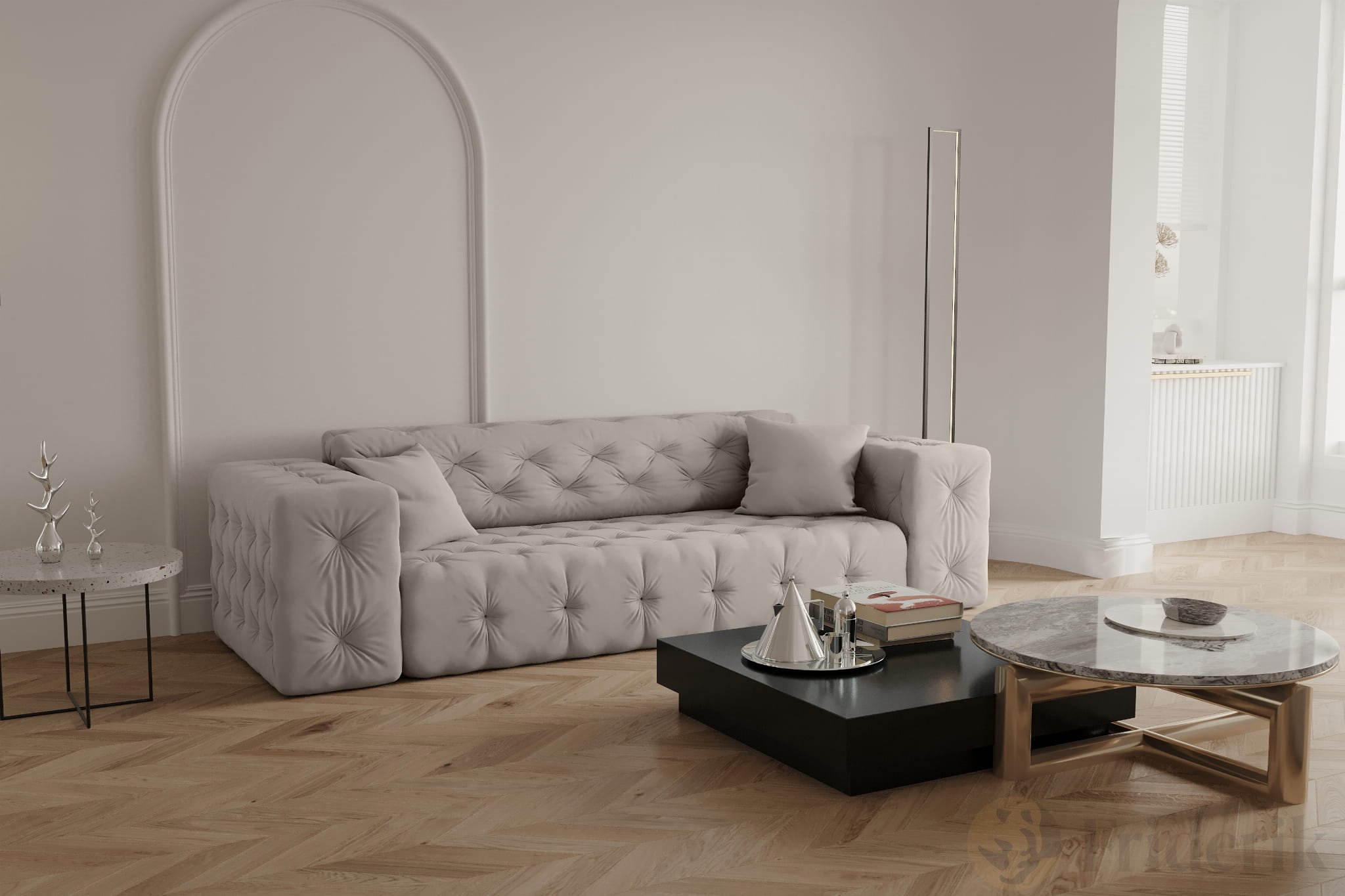 Stellen Sie sich einen entspannten Abend auf einem Sofa vor, das Eleganz und maximalen Komfort vereint. Das Sofa Modest 3-Sitzer besticht durch den klassischen Chesterfield-Stil, weichen und langlebigen Velvet Opera Stoff sowie breite, bequeme Armlehnen. Dekorative Kissen im Set sorgen für eine gemütliche Atmosphäre – perfekt für entspannte Stunden mit Familie und Freunden.