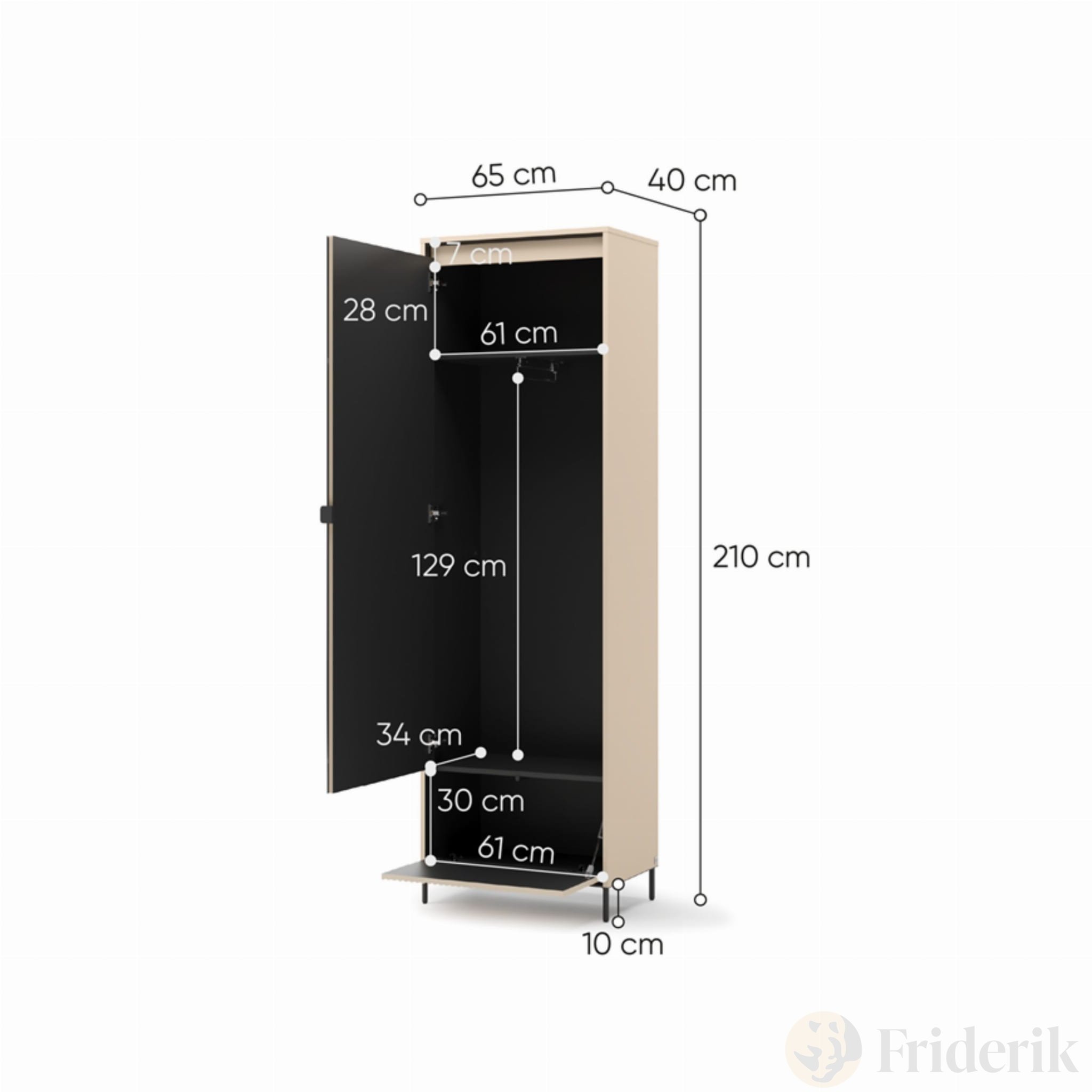 Im Inneren bietet er flexible Aufbewahrungsmöglichkeiten: Regalböden, Kleiderstangen und Schubladen ermöglichen übersichtliches Verstauen von Kleidung, Schuhen und Accessoires.