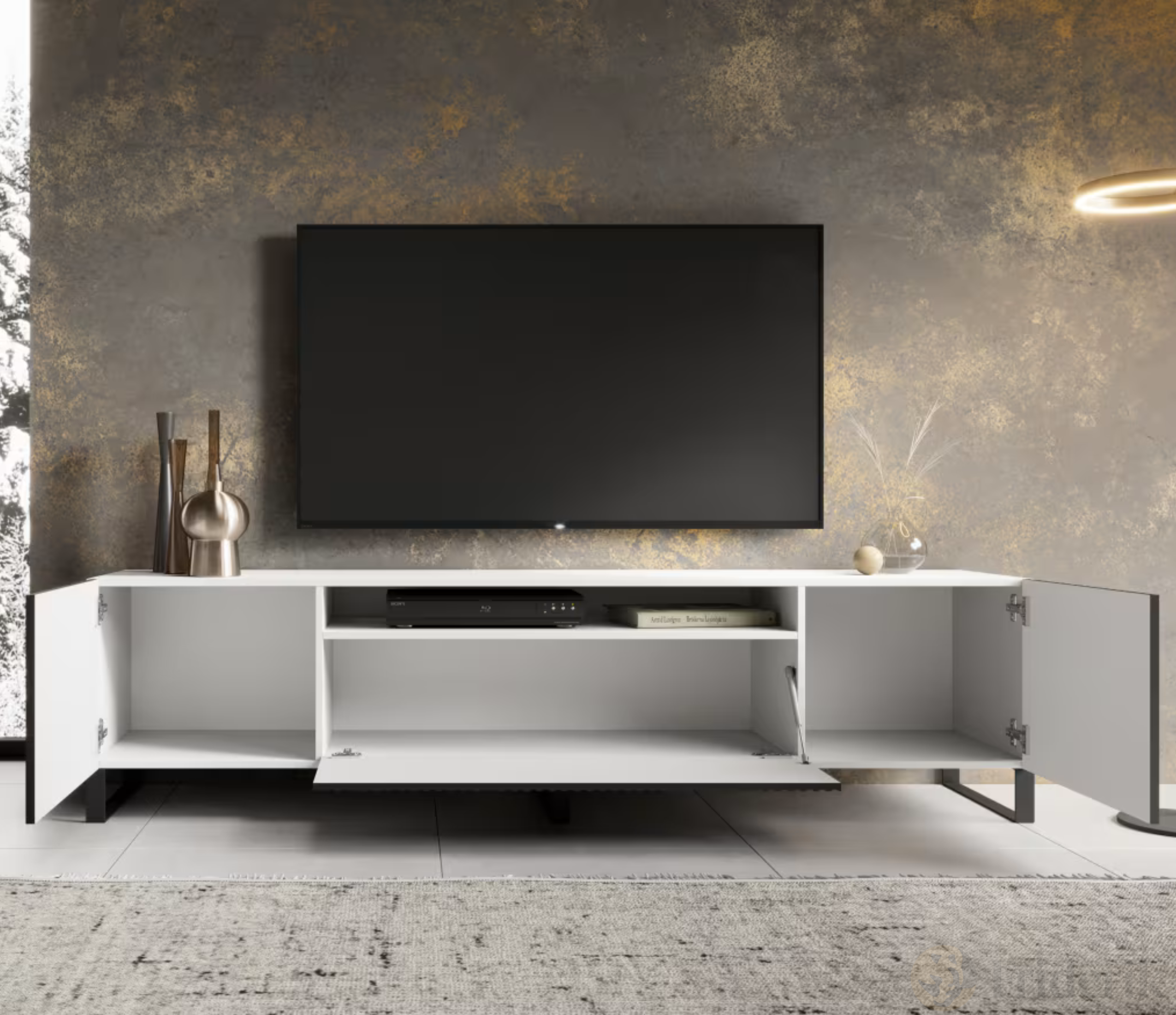 Perfekt geeignet, wenn Sie ein modernes TV-Möbel mit besonderem Design, viel Stauraum für Multimedia-Geräte und eine elegante Ergänzung für Ihr Wohnzimmer suchen.