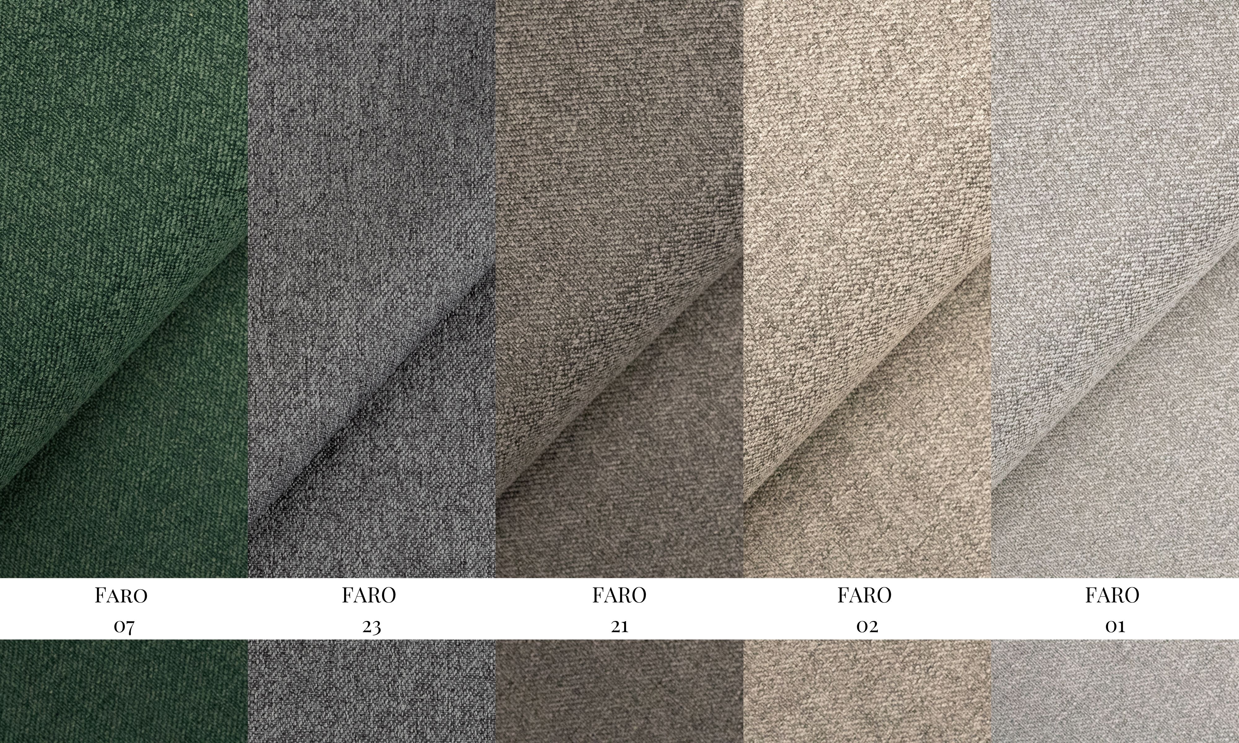 FARO ist ein angenehm weicher Polsterstoff mit feiner Webstruktur aus 100 % Polyester. Die Grammatur von 250 g/m² sorgt für hohe Strapazierfähigkeit im Alltag, während das Material durch seine Struktur luftdurchlässig, komfortabel und pflegeleicht bleibt.