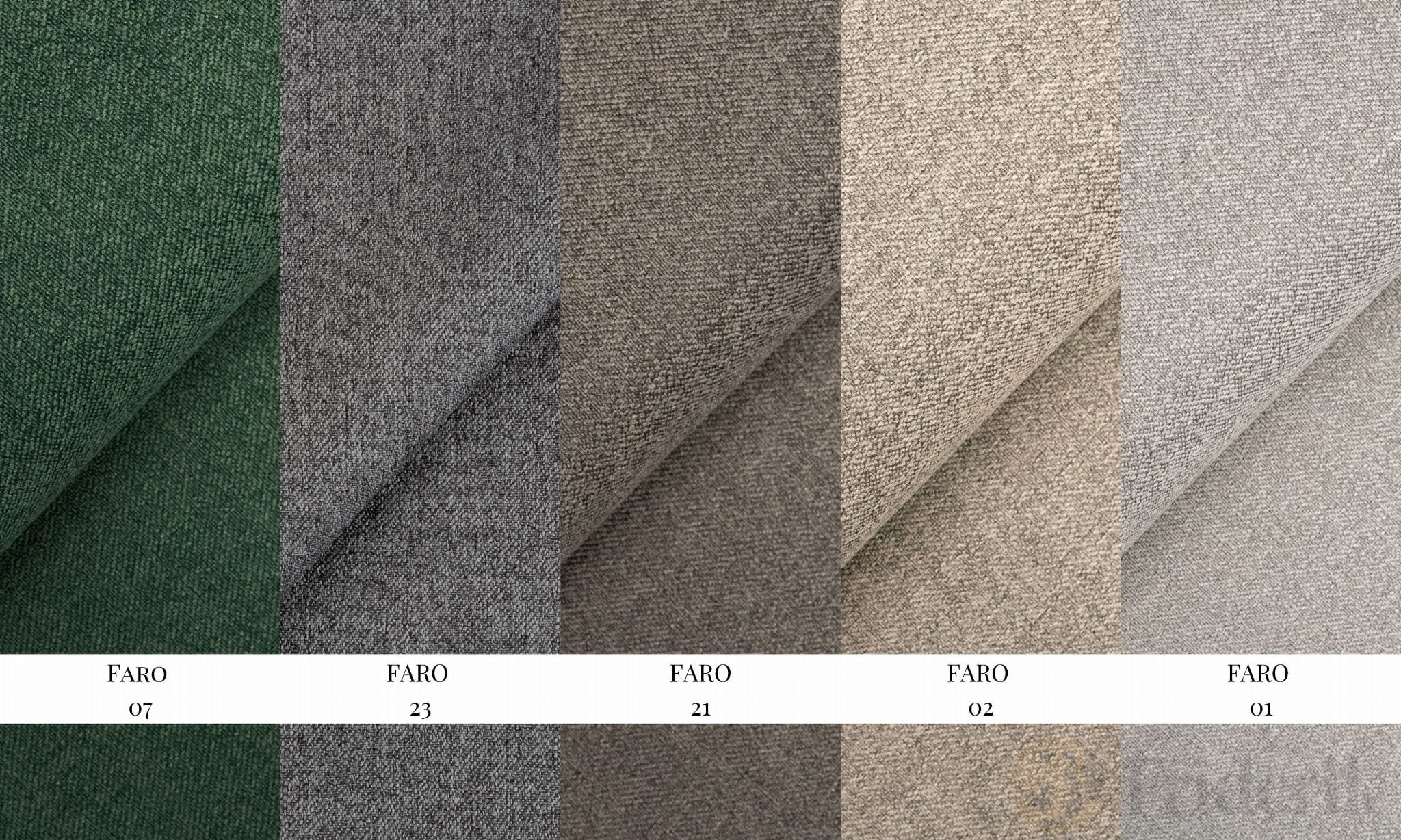 FARO ist ein angenehm weicher Polsterstoff mit feiner Webstruktur aus 100 % Polyester. Die Grammatur von 250 g/m² sorgt für hohe Strapazierfähigkeit im Alltag, während das Material durch seine Struktur luftdurchlässig, komfortabel und pflegeleicht bleibt.