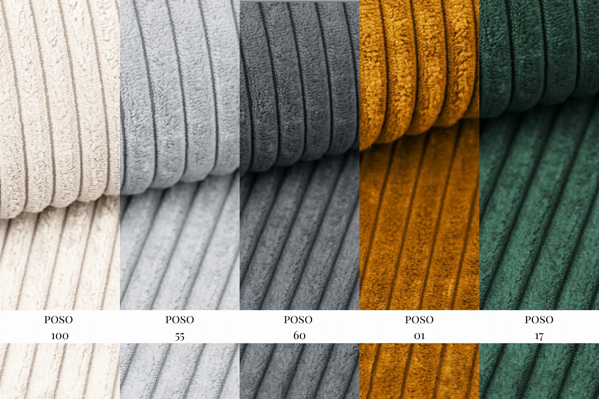 Der POSO Cordstoff verleiht dem Sofa eine besonders angenehme Haptik und eine markante, strukturierte Optik. Die breiten Rippen schaffen eine wohnliche Atmosphäre und machen das Sofa zu einem echten Hingucker. Der Stoff ist langlebig, abriebfest (35.000 Martindale-Zyklen) und pflegeleicht – ideal für Familien, Tierhalter und Designliebhaber. Er passt perfekt in klassische, moderne oder Retro-Innenräume und sorgt für ein komfortables Sitzgefühl.