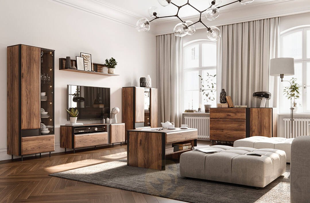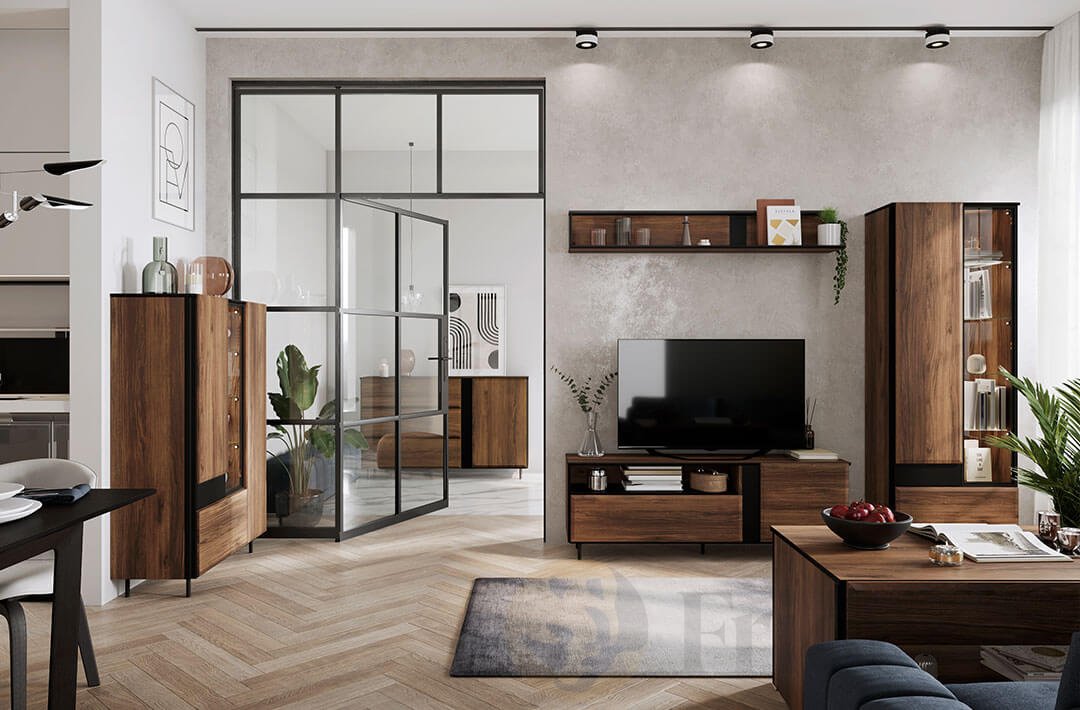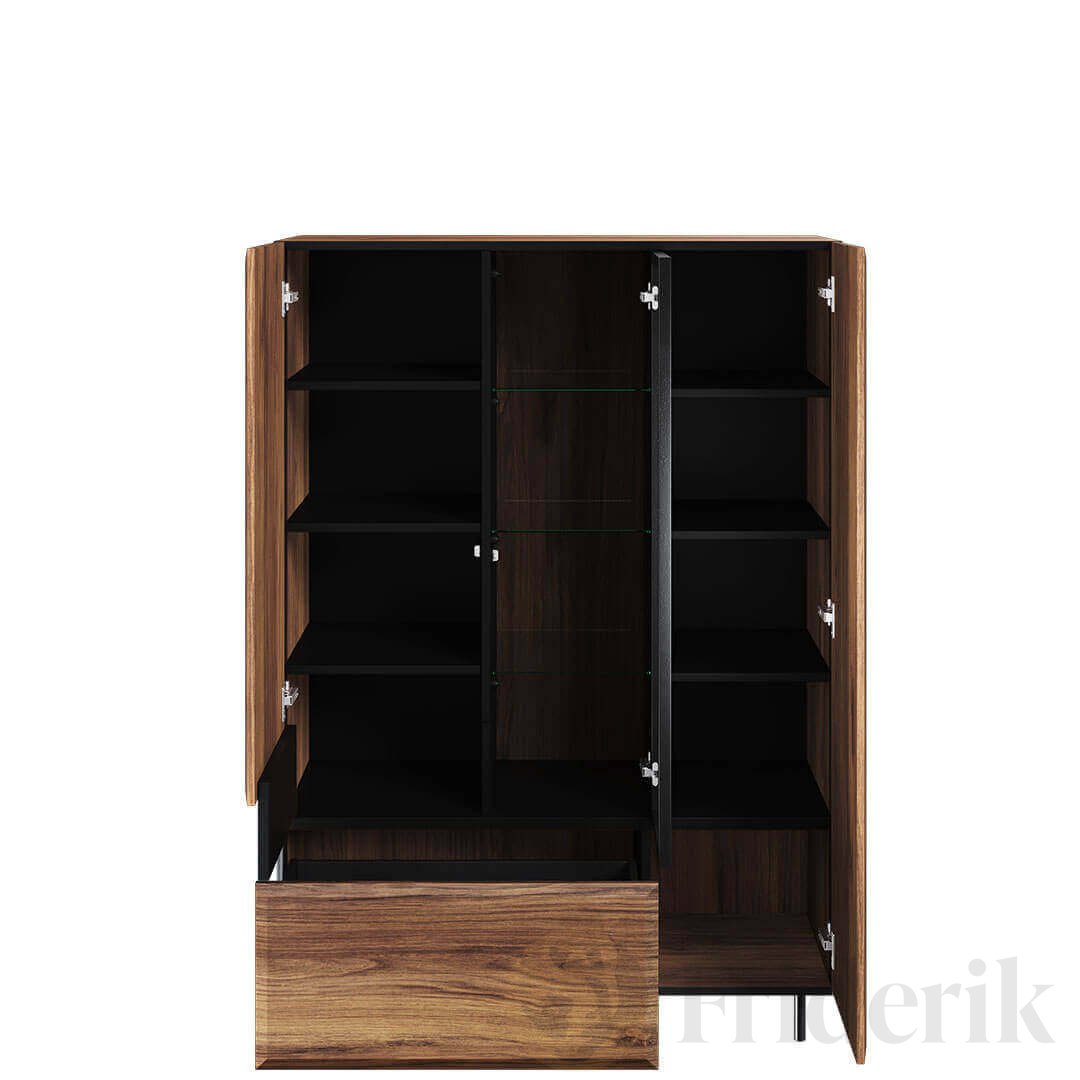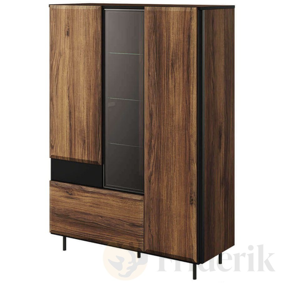 Das Push-to-Open- und/oder Soft-Close-System sorgen für komfortables Öffnen. Die Möbel haben verglaste Teile. Der Schrank hat drei Glasböden. Die Möbel können mit einer gerichteten LED-Beleuchtung ausgestattet werden, mit der Sie den Lichtstrahl auf ausgewählte Objekte richten können, die hinter dem Glas platziert sind. Hinter der Tür befinden sich zwei Innenregale. An der Unterseite des Möbels befindet sich eine geräumige und leicht zugängliche Schublade. Die Möbel bestehen aus einer strapazierfähigen Schichtstoffplatte mit verstärkten ABS-Kanten und einer strapazierfähigen MDF-Platte.