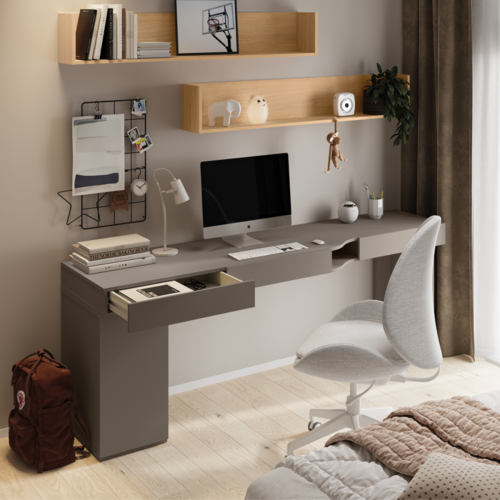 Das klare, minimalistische Design in der edlen Farbkombination Champagner und Clay Grey fügt sich harmonisch in moderne Jugendzimmer ein und schafft eine ruhige, inspirierende Atmosphäre.