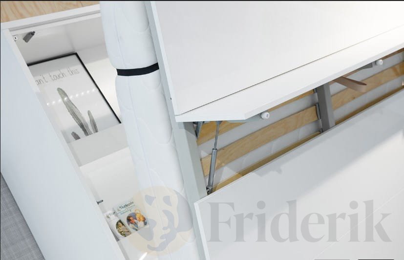 Unser Schrankbett ist mit sehr praktischen Gurten ausgestattet, mit denen die Bettwäsche befestigt wird. Kissen und Bettdecken verschwinden so einfach zusammen mit dem Bett im Schrank. Dies ist eine großartige Nachricht für alle, die nicht jeden Tag gerne Betten machen oder keine Zeit dafür haben.