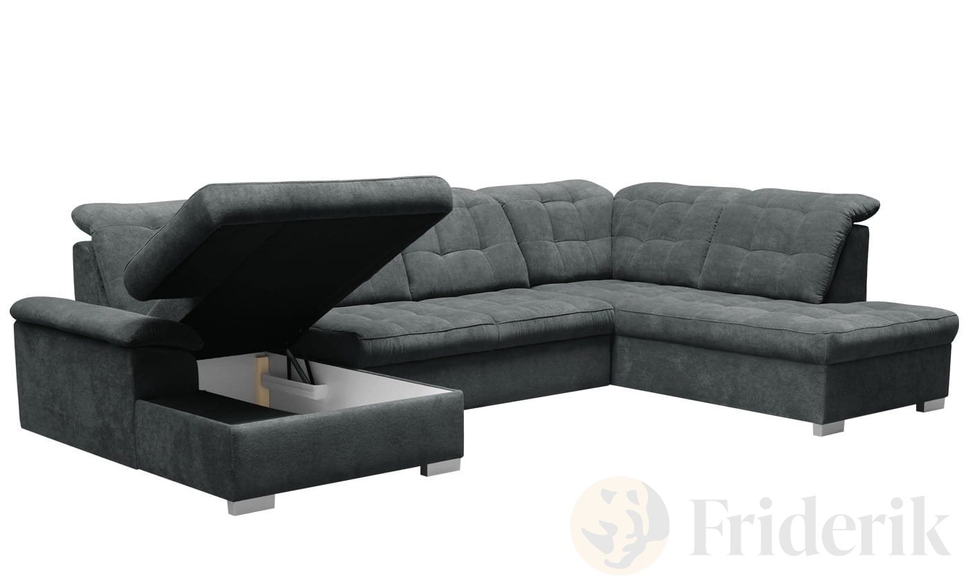 Die hochwertige Polsterung aus Wellenfedern und HR-Schaum sorgt für langlebigen Sitzkomfort. Ein integrierter Bettkasten bietet praktischen Stauraum, und dank der bezogenen Rückseite lässt sich das Sofa frei im Raum platzieren.